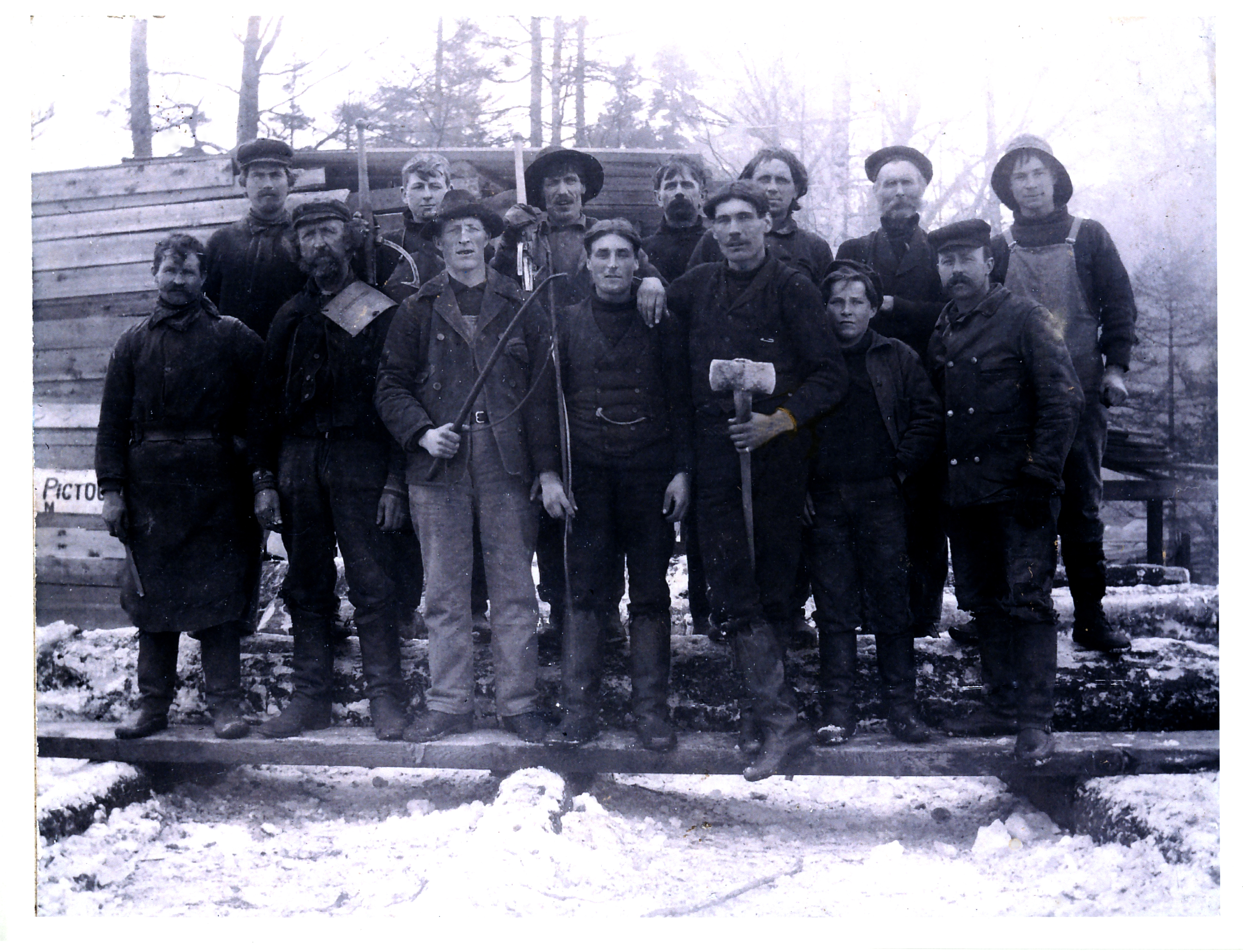 A group of lumberers posing for the camera. Location is unknown, but the photo was found in a home in Loganville, Pictou County. Possibly the Baillie home.