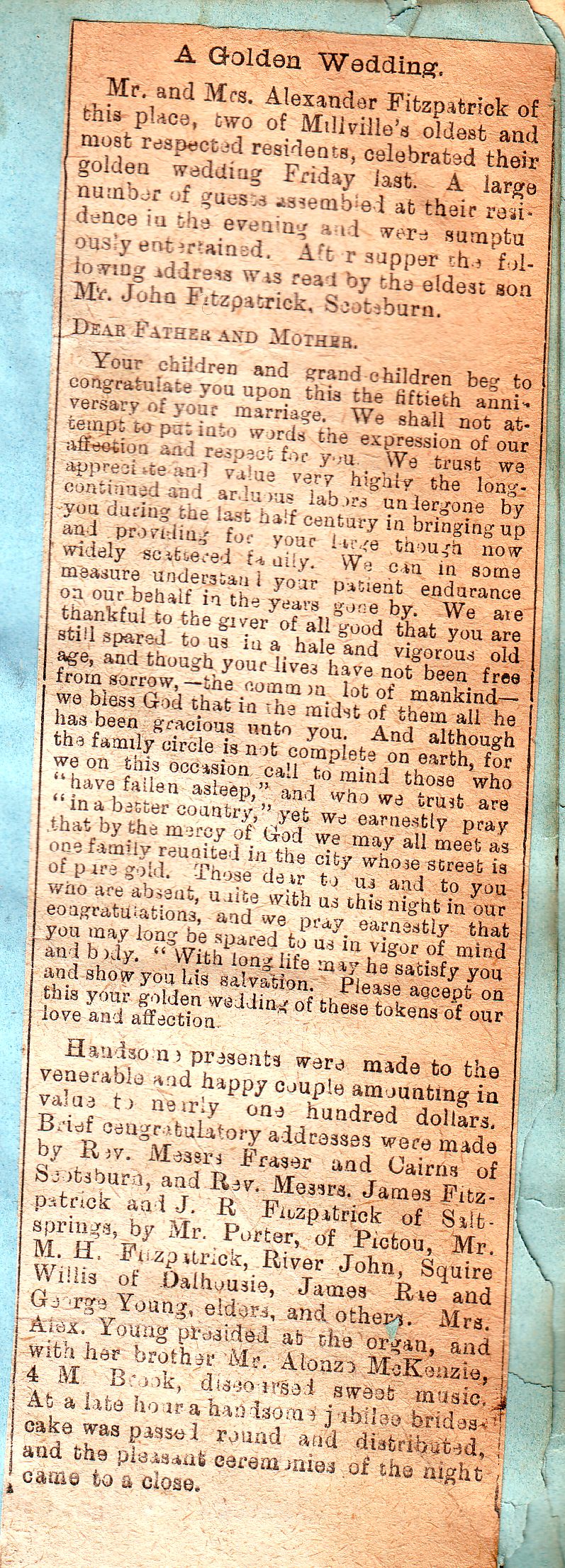 "A Golden Wedding", a clipping from an unidentified and undated newspaper recounting the 50th wedding anniversary celebrations of Alexander Fitzpatrick (1810-1896) and Mary Rae (1822-1902). Married on 22 March 1839. Pasted in the personal scrapbook of his nephew, Alexander Parker Willis.