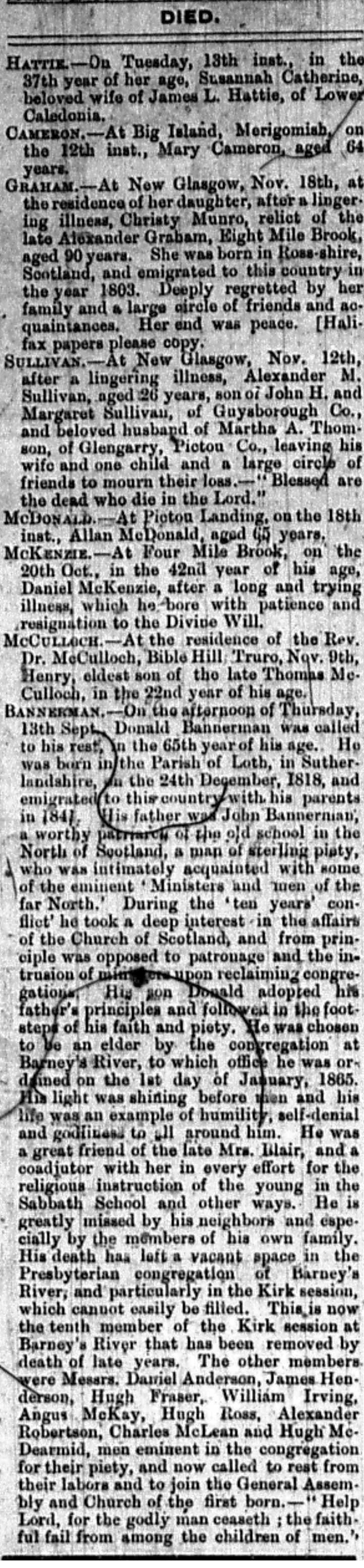 BANNERMAN - On the afternoon of Thursday, 13th Sept., Donald Bannerman was called to his rest, in the 65th year of his age. He was born in the Parish of Loth in Sutherlandshire, on the 24th December, 1818, and emigrated to this country with his parents in 1841. His father was John Bannerman, a worthy patriarch of the old school in the North of Scotland, a man of sterling piety, who was intimately acquainted with some of the eminent 'Ministers and men of the far North.' During the 'ten years' conflict he took a deep interest in the affairs of the Church of Scotland, and from principle was opposed to patronage and the intrusion of ministers upon reclaiming congregations. His son Donald adopted his father's principles and followed in the footsteps of his faith and piety. He was chosen to be an elder by the congregation at Barney's River, to which office he was ordained on the 1st day of January, 1865. His light was shining before men and his life was an example of humility, self-denial amd godliness to all around him. He was a great friend of the late Mrs. Blair, and a coajutor with her in every effort for the religious instruction of the young in the Sabbath School and other ways. He is greatly missed by his neighbours and especially by the members of his own family. His death has left a vacant space in the Presbyterian congregation of Barney's River, and particularly in the Kirk session, which cannot easily be filled. This is now the tenth member of the Kirk session at Barney's River that has been removed by death of late years. The other members were Messrs. Daniel Anderson, James Henderson, Hugh Fraser, William Irving, Angus McKay, Hugh Ross, Alexander Robertson, Charles McLean and Hugh McDearmid, men eminent in the congregation for their piety, and now called to rest form their labors and to join the General Assembly and Church of the first born. - "Help Lord, for the godly man ceaseth; the faithful fail from among the children of men."