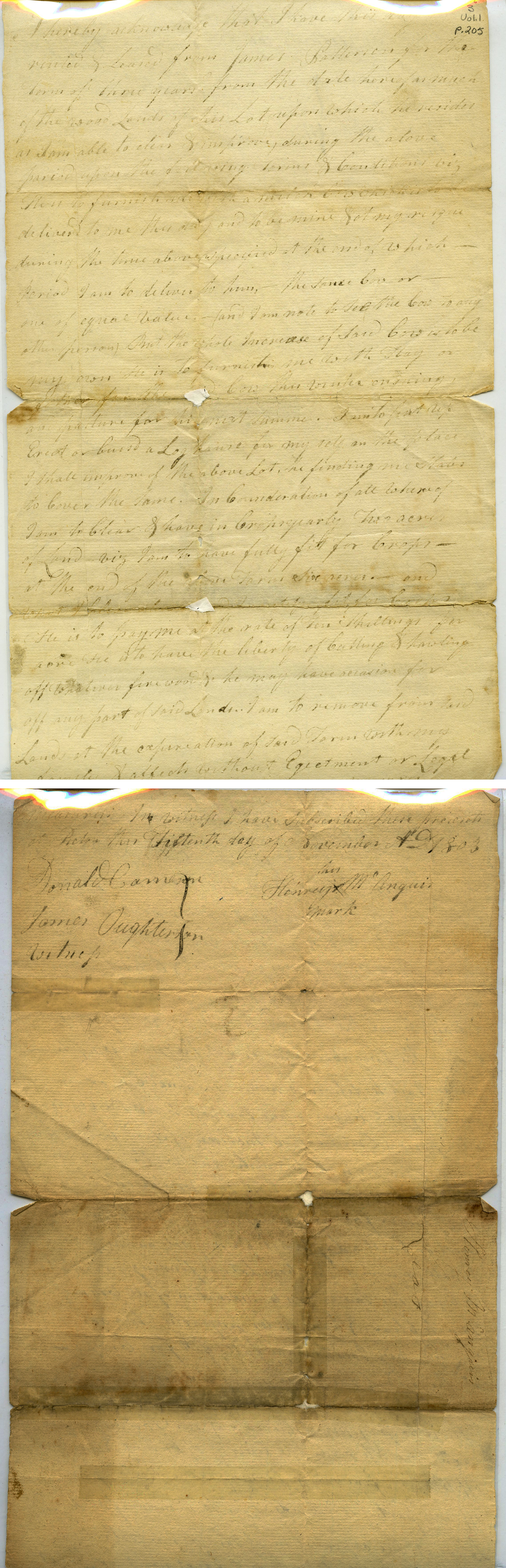 I hereby acknowledge that I have this day rented and leased from James Patterson for the term of three years from the date here of as much of the wood lands of his lot upon which he resides as I am able to clear and improve during the above period upon the following terms and conditions viz. He is to furnish me with a milch cow which is to be delivered to me this day and to be mine and at my risque during the time above specified at the end of which period I am to deliver to him the same cow or one of equal value (and I am not to sell the cow to any other person). But the whole increase of said cow is to be my own. He is to furnish me with hay or fodder for the cow this winter or spring and pasture for his next summer. I am to put up, erect or build a log house for my self on this place. I shall improve of the above lot, he finding me slabs to cover the same. In consideration of all where of I am to clear and have in crop yearly. Two acres of land, viz. I am to have fully fit for crops, at the end of the above term six acres and what I labour --------- fit for crops. He is to pay me at the rate of ten shillings per acre. He is to have the liberty of cutting and hauling off whatever pine wood he may have occasion for off any part of said lands. I am not to remove from said land at the expiration of said term with my family and affects without ejectment or legal measures.