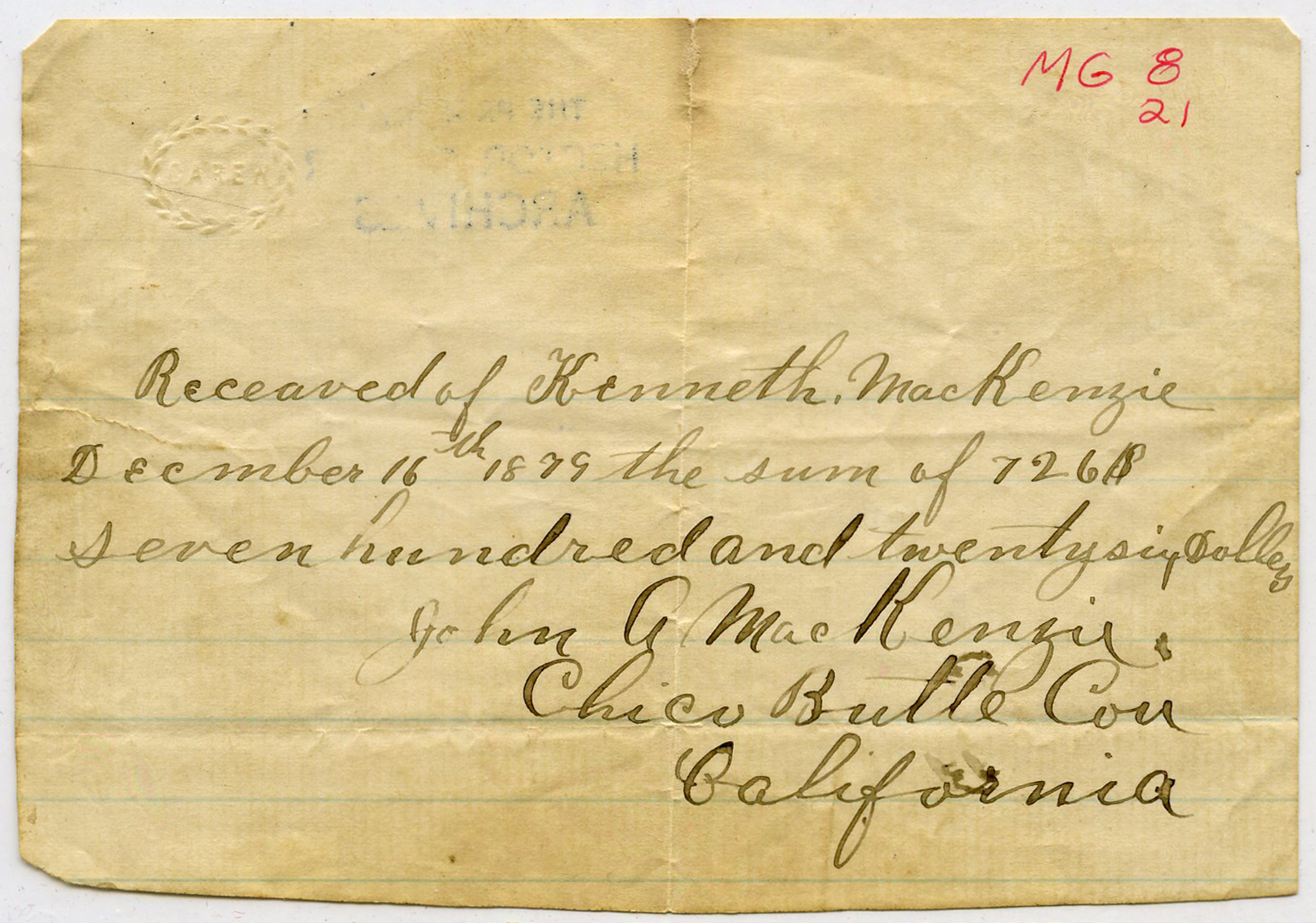 Receaved of Kenneth MacKenzie, December 16th 1879 the sum of 726$, Seven hundred and twenty six dollers