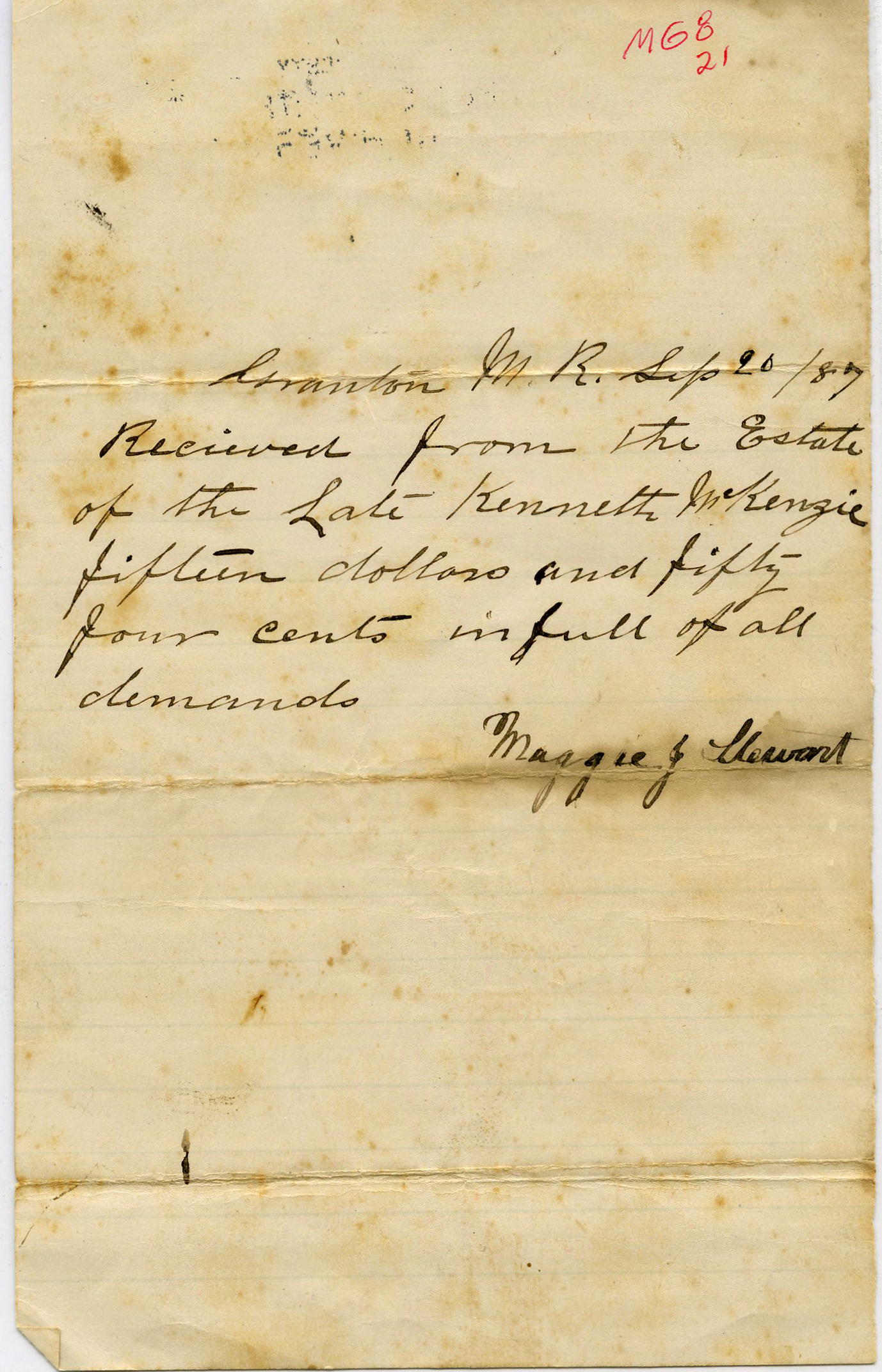 Recieved from the Estate of the Late Kenneth McKenzie fifteen dollars and fifty four cents in full of all demands.