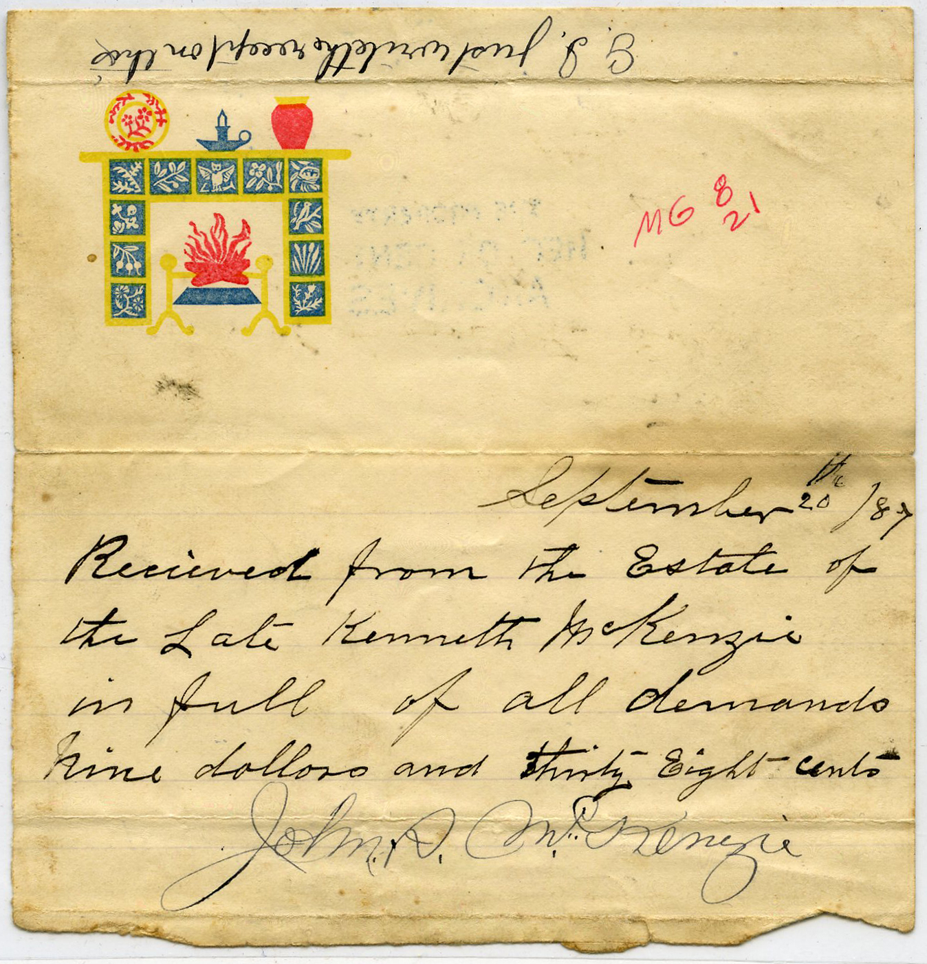 Received from the Estate of the Late Kenneth McKenzie in full of all demands Nine dollars and thirty Eight cents.