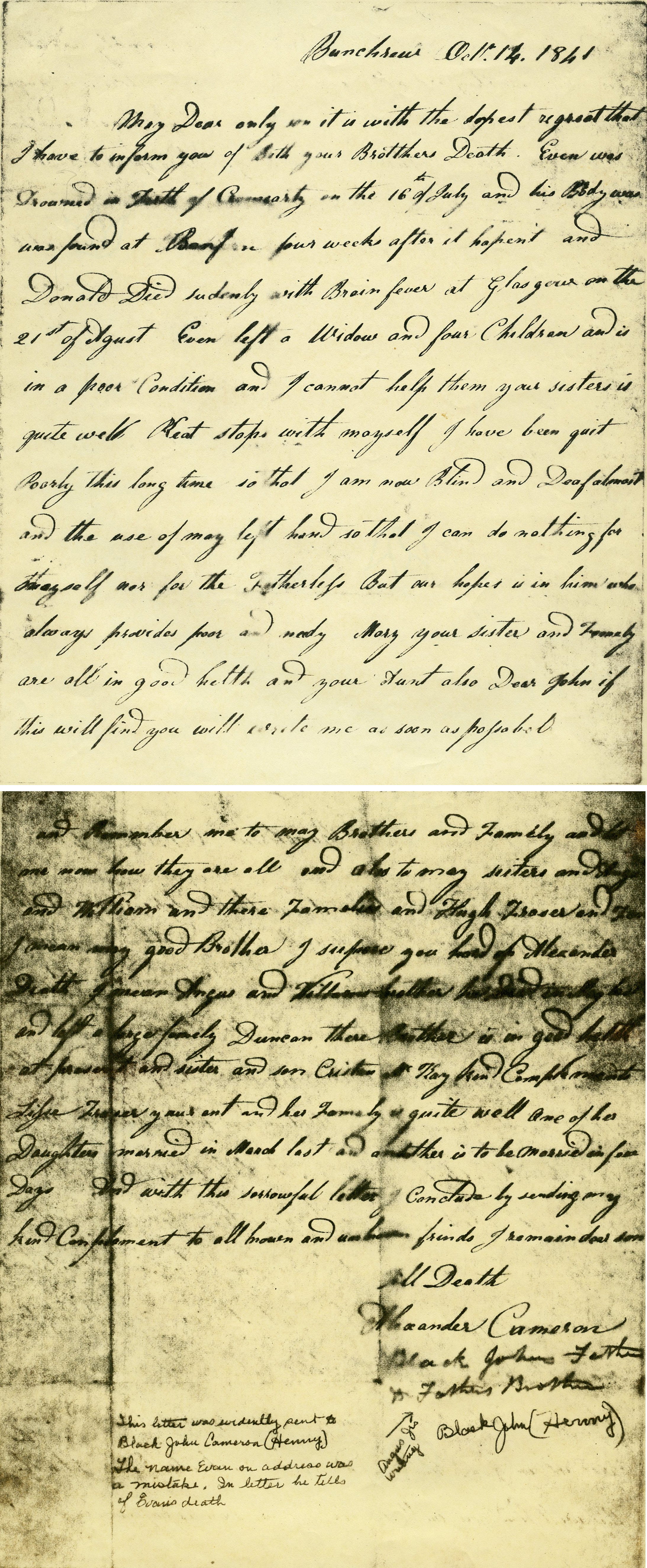 My Dear only son it is with the deepest regret that I have to inform you of both your brothers death. Euen was drowned in Firth of Comarty on the 16th day of July and his body was found at Banfor? four weeks after it happened and Donald died suddenly with brain fever at Glasgow on the 21st of August. Euen left a widow and four children and is in a poor condition and I cannot help them. Your sister is quite well. Keat stops with myself I have been quiet poorly this long time so that I am now blind and deaf almost and the use of my left hand so that I can do nothing for myself nor the for the fatherless. But our hopes is in him who always provides poor and needy. Mary your sister and family are all in good health and your Aunt also. Dear John if this will find you will write me as soon as possible and remember me to my brother and family and let one know how they are all and also to my sisters and Angus* and William and the females and Hugh Fraser and family* I mean --- good brother I supose you heard of Alexanders death of --- Angus and Williams brother he died in May last* and left a large family. Duncan their brother* is in good health at present and sister and son C--- McKay kind compliments Lissie Fraser your aunt and her family is quite well. One of her daughters married in March last and another is to be married in a few days. And with this sorrowful letter I conclude by sending my kind compliment to all known and unknown friends, I remain dear son