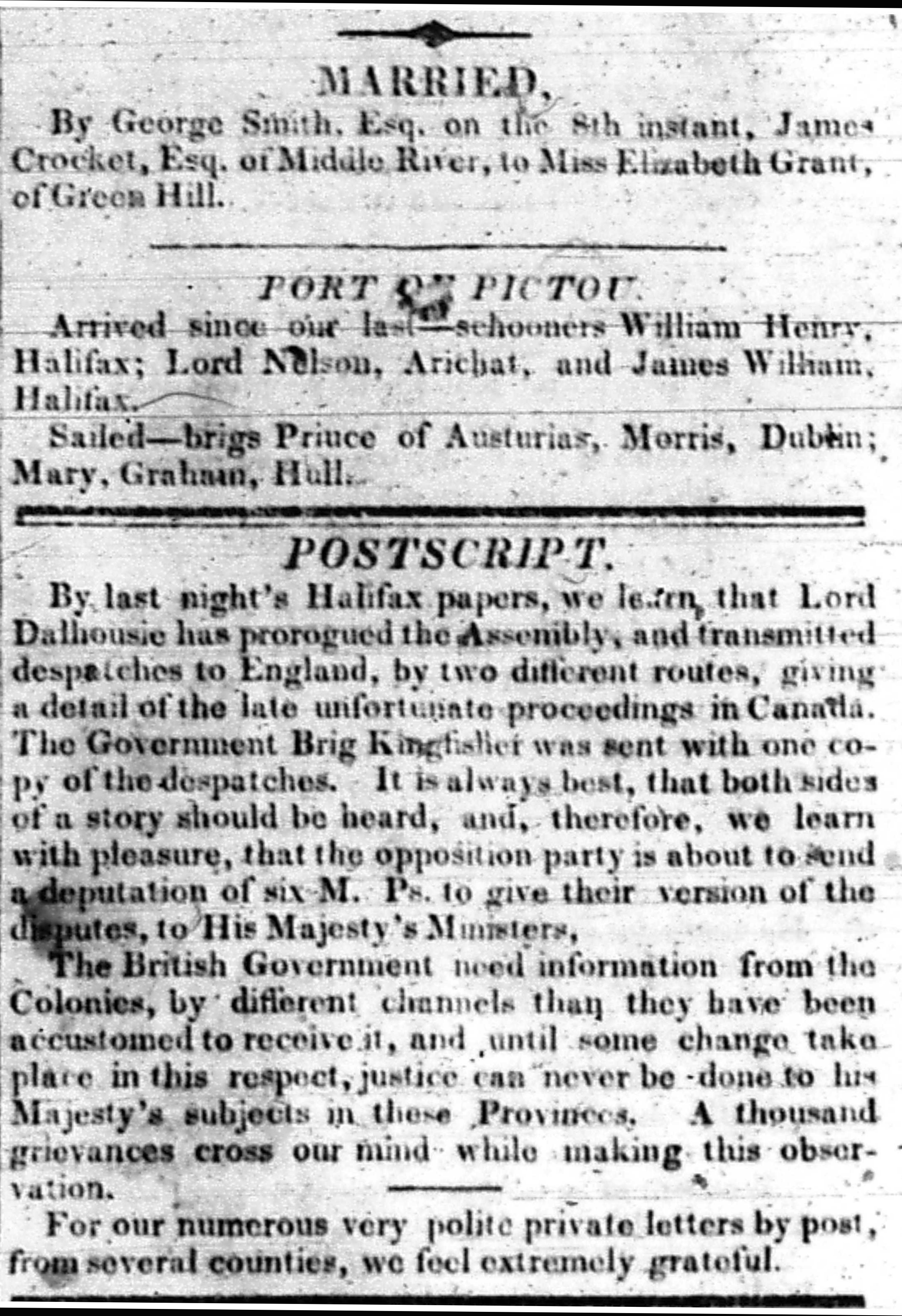 By last night's Halifax papers, we learn that Lord Dalhousie has prorogued the Assembly, and transmitted despatches to England, by two different routes, giving a detail of the late unfortunate proceedings in Canada. The Government Brig Kingfisher was sent with one copy of the despatches. It is always best, that both sides of a story should be heard, and therefore, we learn with pleasure, that the opposition party is about to send a deputation of six M.P.s to give their version of the disputes, to His Majesty's Ministers. The British Government need information from the Colonies, by different channels that they have been accustomed to receive it, and until some change takes place in this respect, justice can never be done to his Majesty's subjects in these Provinces. A thousand grievances cross our mind while making this observation.