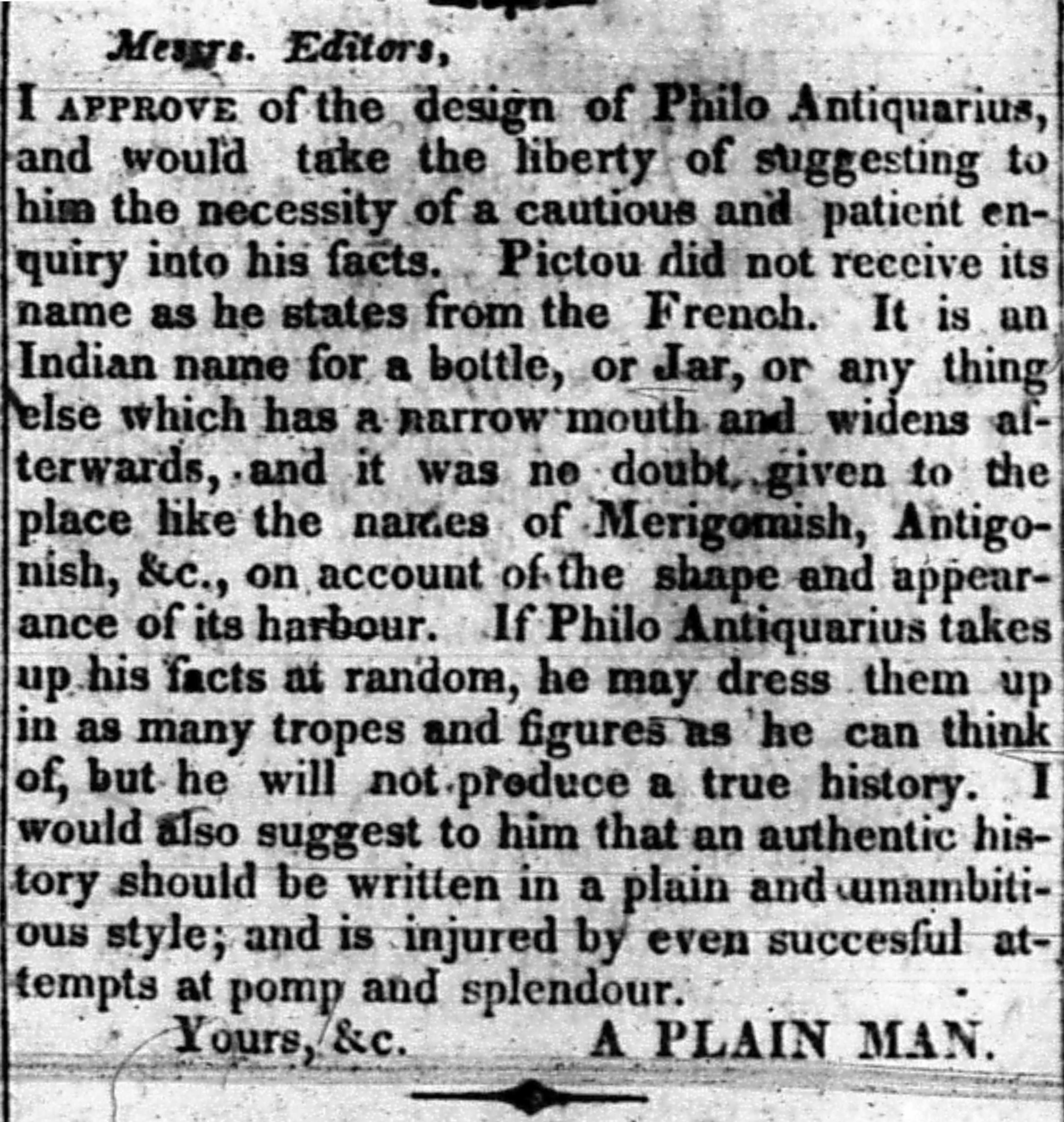 I approve of the design of Philo Antiquarius, and would take the liberty of suggesting to him the necessity of a cautious and patient enquiry into his facts. Pictou did not receive its name as he states from the French. It is an Indian name for a bottle, or Jar, or anything else which has a narrow mouth and widens afterwards, and it was no doubt, given to the place like the names of Merigomish, Antigonish, &c., on account of the shape and appearance of its harbour. If Philo Antiquarius takes up his facts at random, he may dress them up in many tropes and figures as he can think of, but he will not produce a true history. I would also suggest to him that an authentic history should be written in a plain and unambitious style; and his injured by even succesful attempts at pomp and splendour.