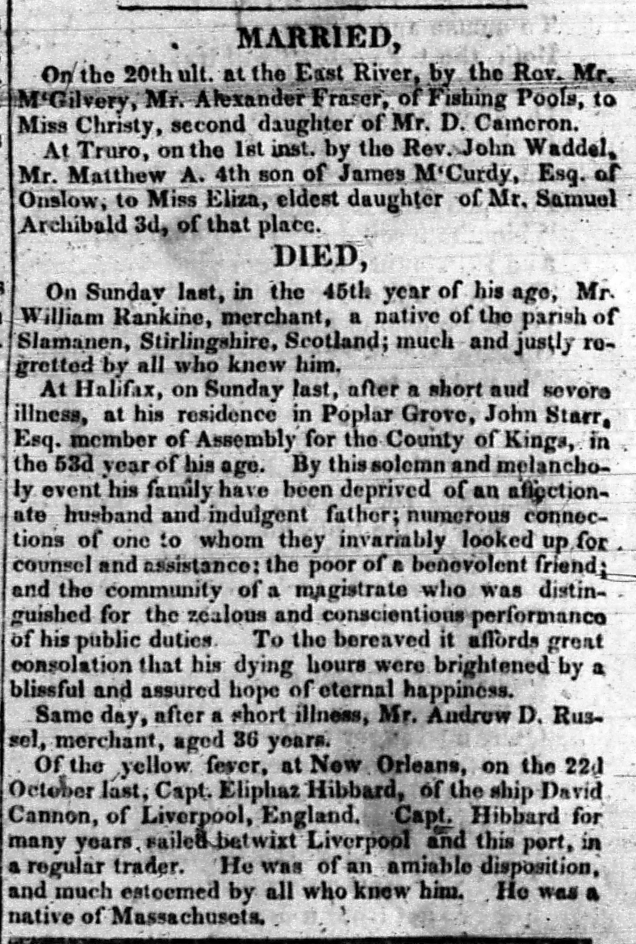 At Halifax, on Sunday last, after a short and severe illness, at his residence in Poplar Grove, John Starr, Esq. member of Assembly for the County of Kings, in the 53d year of his age. By this solemn and melancholy event his family have been deprived of an afftectionate husband and indulgent father; numerous connections of one to whom the invarably looked up for counsel and assistnace; the poor of a benevolent friend; and the community of a magistrate who was distinquished for the zealous and conscientious performance of his public duties. To the bereaved it affords great consolation that his dying hours were brightened by a blissful and assured hope of eternal happiness.