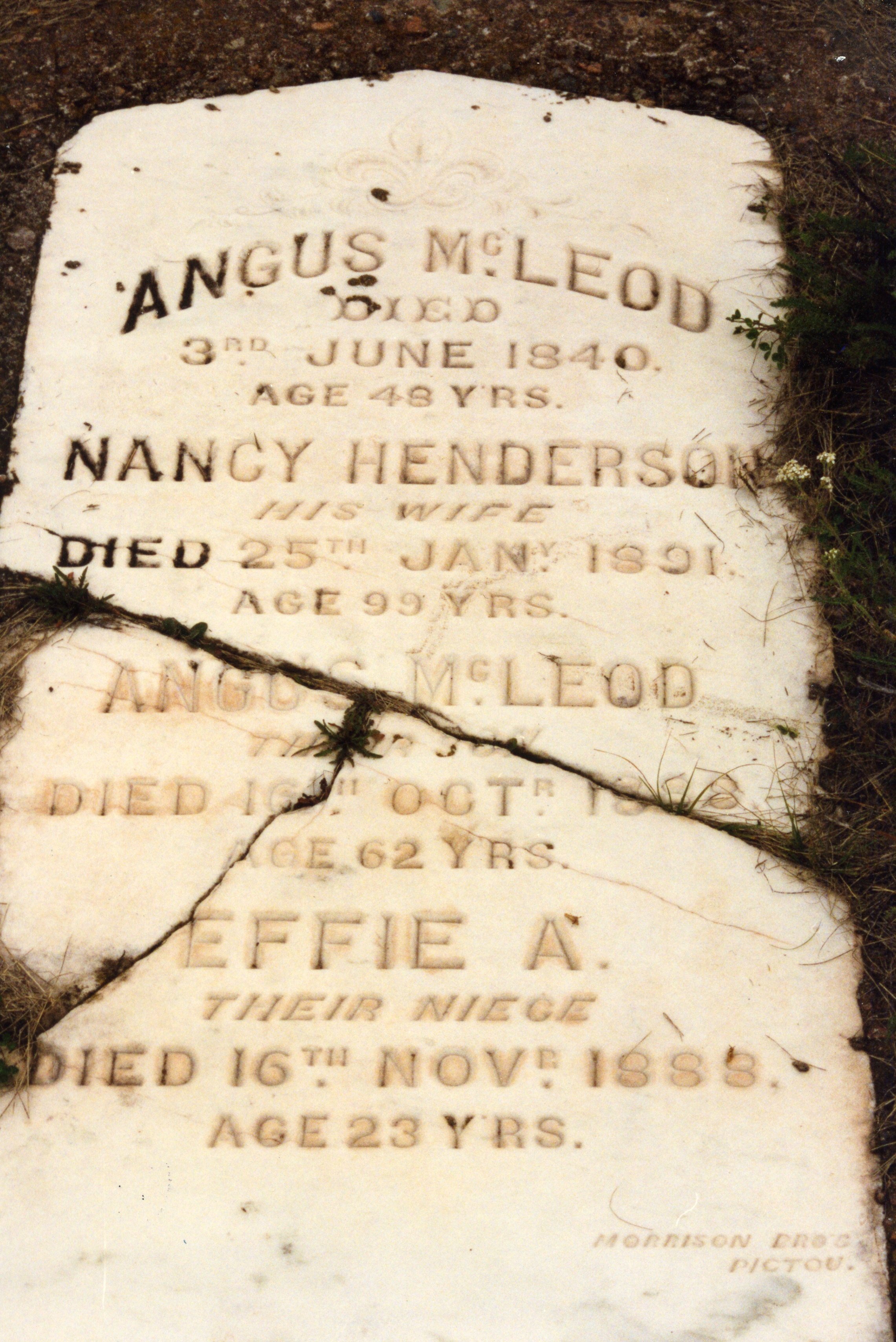 Headstone looks like it is broken and is engraved with: Angus McLeod Died 3rd June 1840. age 48 yrs. Nancy Henderson His Wife Died 25th Jan"1821. Age 99 Yrs. Angus McLeod Their Son Died 16th Oct 18__ Age 62 Yrs. Effie A Their Niece Died 16th Nov. 1888. Age 23 YRS.