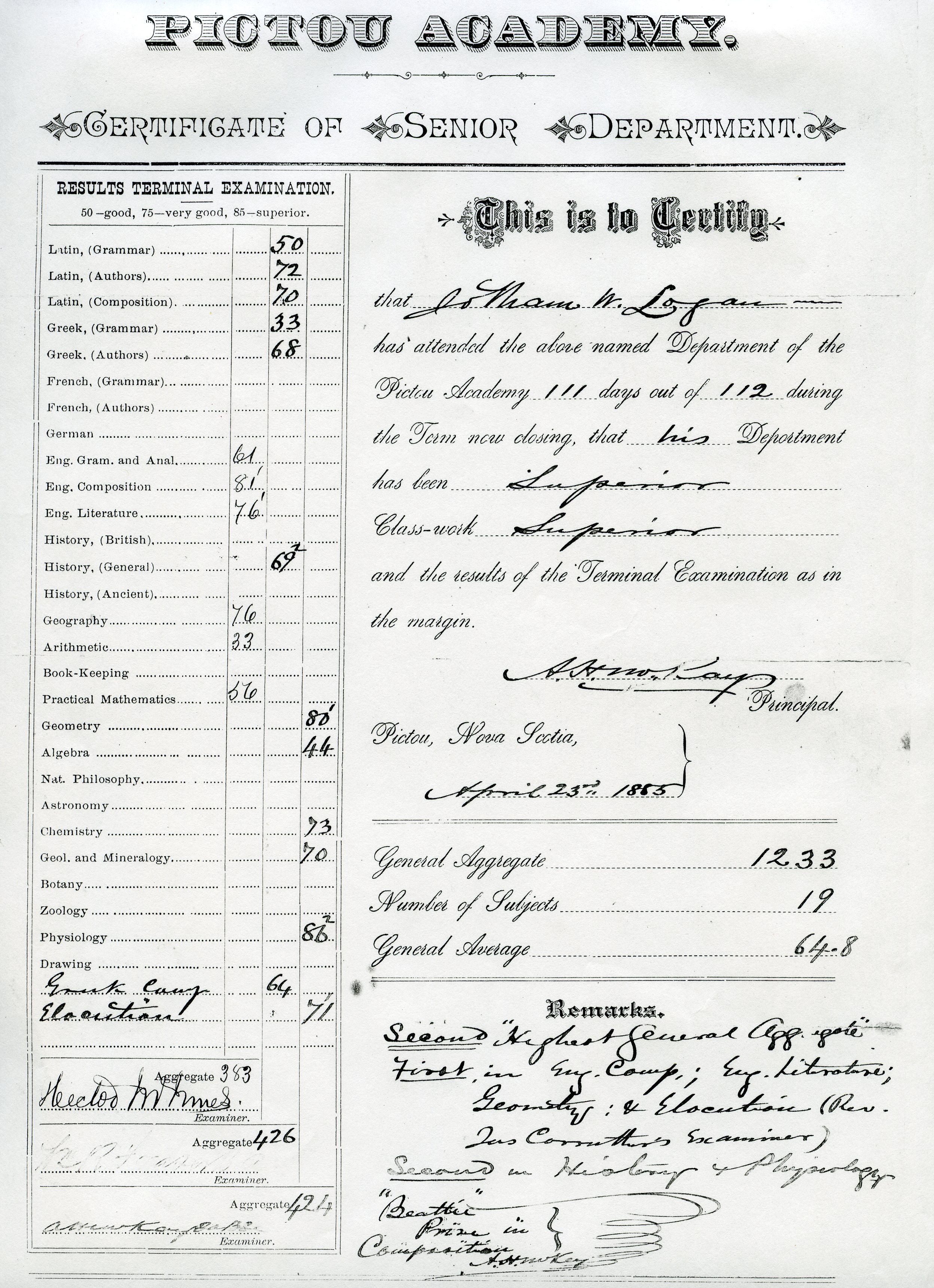 This Is To Certify that Jotham W Logan has attended the above named department of the Pictou Academy 111 days our of 112 during the term now closing, that his department has been Superior Class Work Superior and the results of the Terminal Examination as in the margin .