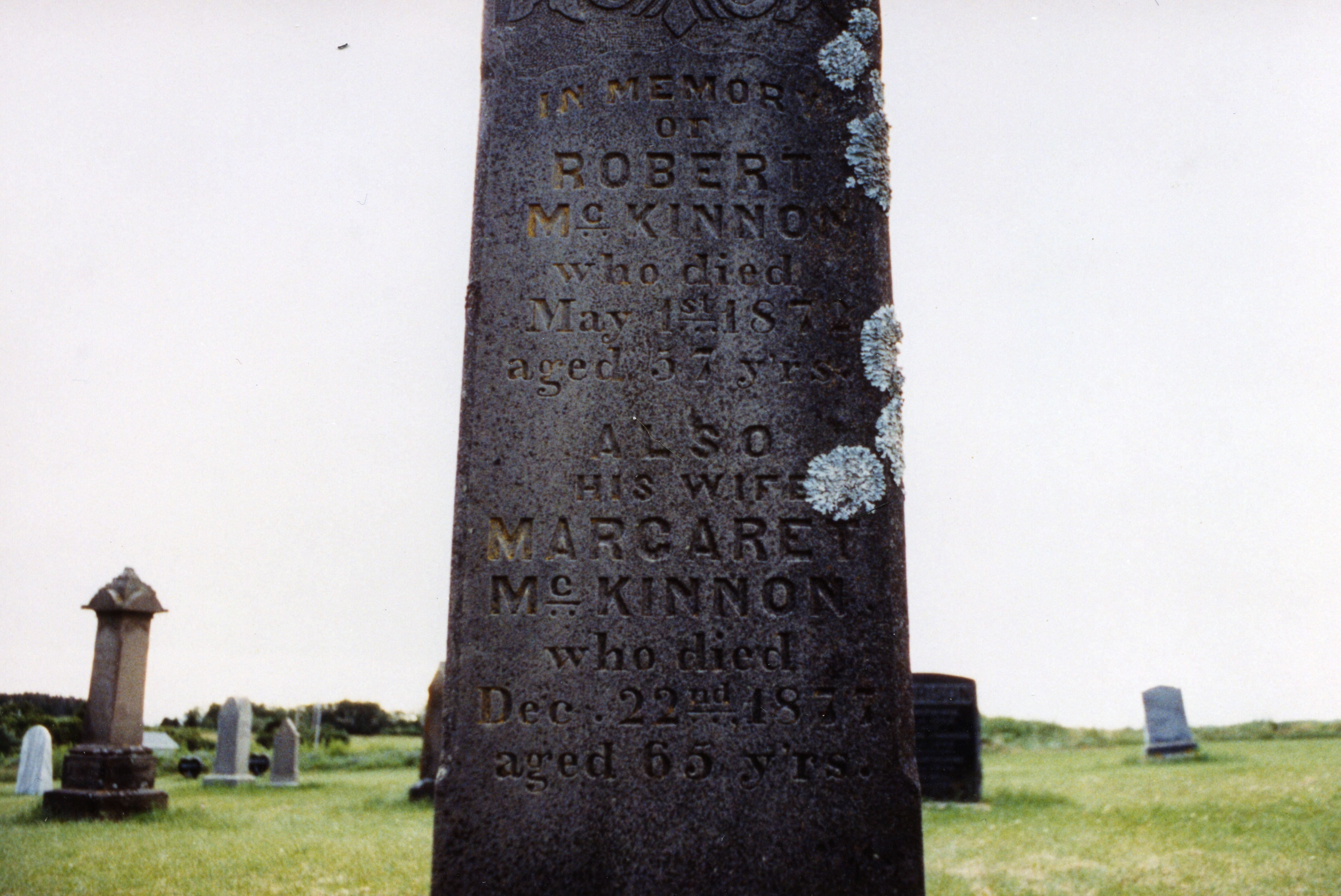 Inscribed on stone: In Memory OF Robert McKinnon who died May 1st, 1872. aged 57 yrs. Also His Wife Margaret McKinnon who died Dec. 22nd 1877 aged 65 yrs.