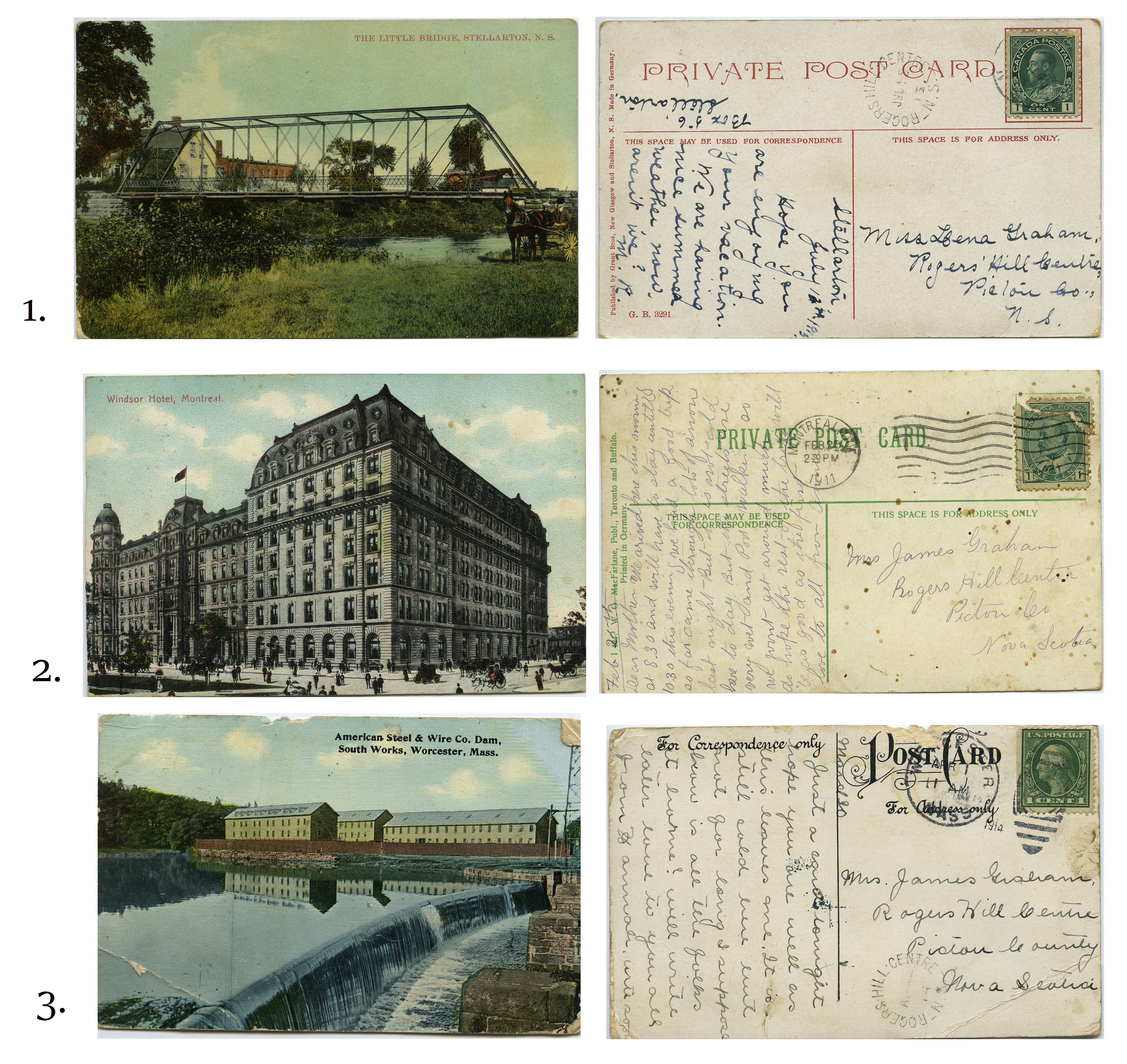 | Tags: | Stellarton, Little Bridge Stellarton, Rogers Hill, Rogers Hill Centre, Lena Graham, Graham, 1913, colored postcard, horse and buggy, iron bridge, Montreal, Windsor Hotel, 1911, Mrs. James Graham, Anna Graham, 1914, American Steel & Wire Company Dam, South Works, Worcester, Massachusetts |