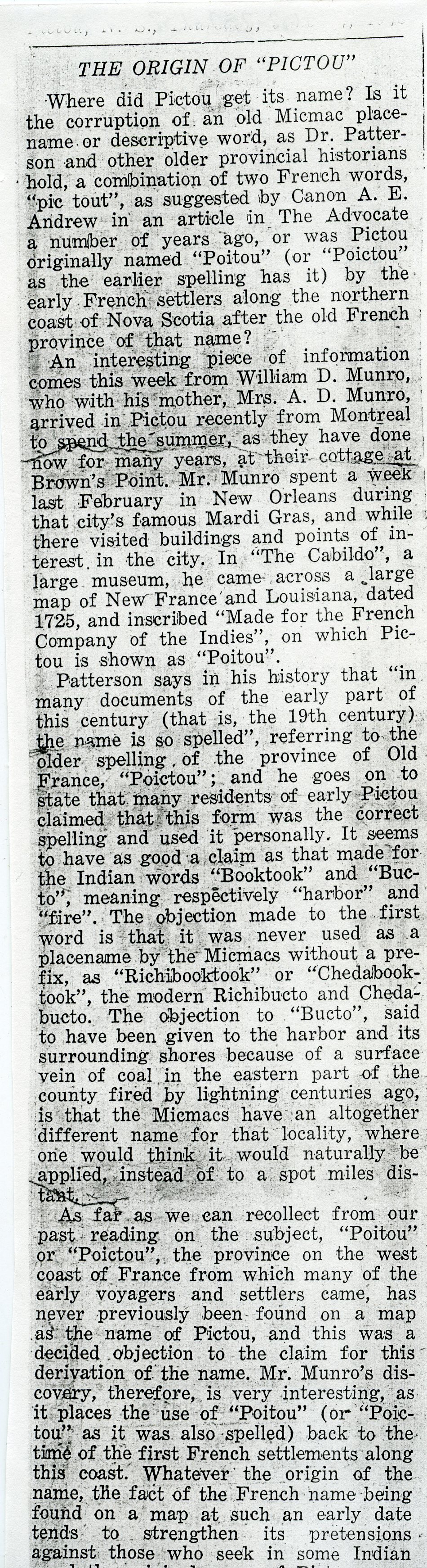 Where did Pictou get its name? Is it the corruption of an old Micmac placename or descriptive word, as Dr, Patterson and other older provincial historians hold a combination of two French Words, “ pic tout “, as suggested by Canon A.E. Andrew in an article in the Advocate a number of years ago, or was Pictou originally named “Poitou “ (or Poictou” as the earlier spelling has it”) by the early French settlers along the northern coast of Nova Scotia after the old French province of the name ? An Interesting piece of information comes the week from William D. Munro, Who with his mother, Mrs. A.D. Munro , Arrived in Pictou recently from Montreal to spend the summer, as they have done now for many years, at their cottage at Brown’s Pont. Mr. Munro spent a week last February in New Orleans during that city’s famous Mardi Gras, and while there visited buildings and points of interest in the city. In “The Cabildo”, a large museum, he came across a large map of New France and Louisiana, dated 1725, and inscribed “ made for the French Company of the Indies”, on which Pictou is shown as “ Poitou”. Patterson says in his history that “in many documents of the early part of this century ( that is, the 19th century) the name is so spelled” , referring to the older spelling of the province of old france, “ Poictou”; and he goes on to state that many residents of early Pictou claimed that this form was the correct spelling and used it personally. It seems to have as good a claim as that made for the Indian words “ Booktook” and “Bucto”, meaning respectively “ harbor” and “ fire”. The odjection made to the first word is that it was never used as a placename by the micmacs without prefix , as “ Richibooktook” or “ Chedabooktool”, the modern Richibucto and Chedabucto. The objection to “bucto”, said to have been given to the harbor and its surrounding shores because of a surface vein of coal in the eastern part of the county fired by lightning centuries ago,is that the Micmac have an altogether different name for that locality, where one would think it would naturally be applied, instead of to a spot miles distant. As far as we can recollect from our past reading on the subject, “Poitou” or “ Poictou”, the province on the west coast of france from which many of the early voyagers and settlers came, has never previously been found on a map as the name Pictou, and this was a decided objection to the claim for this derivation of the name. Mr munro’s discovery, therefore, is very interesting, as it places the use of “ poitou” ( or “Poictou” as it was also spelled) back to the time of the first French settlemants along the coast. Whatever the origin of the name , the fact of the French name being found on a map at such an early date tends to strengthen its pretensions against those who seek in some Indian word the original name of Pictou.