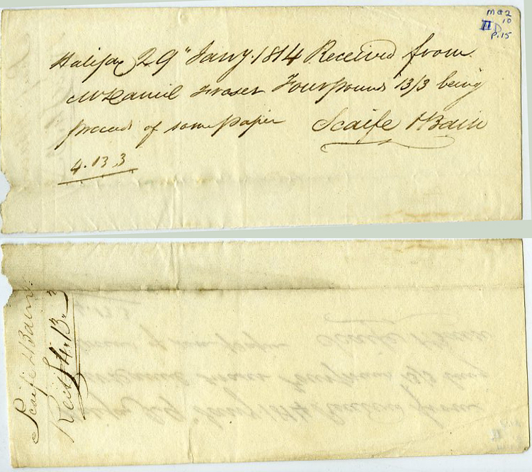 Halifax 29" January 1814 Received from Mr Daniel Fraser four pounds 13/3 being procured* of some paper
