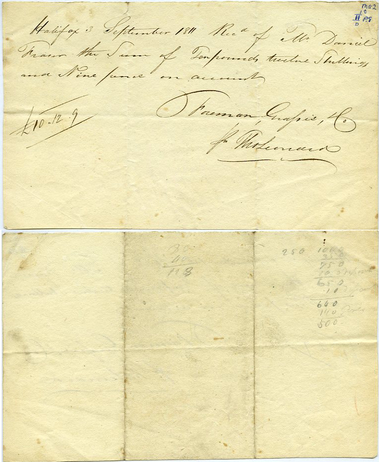 Halifax 3 September 1811 Recd of Mr. Daniel Fraser the sum of ten pounds twelve shillings and nine pence on account