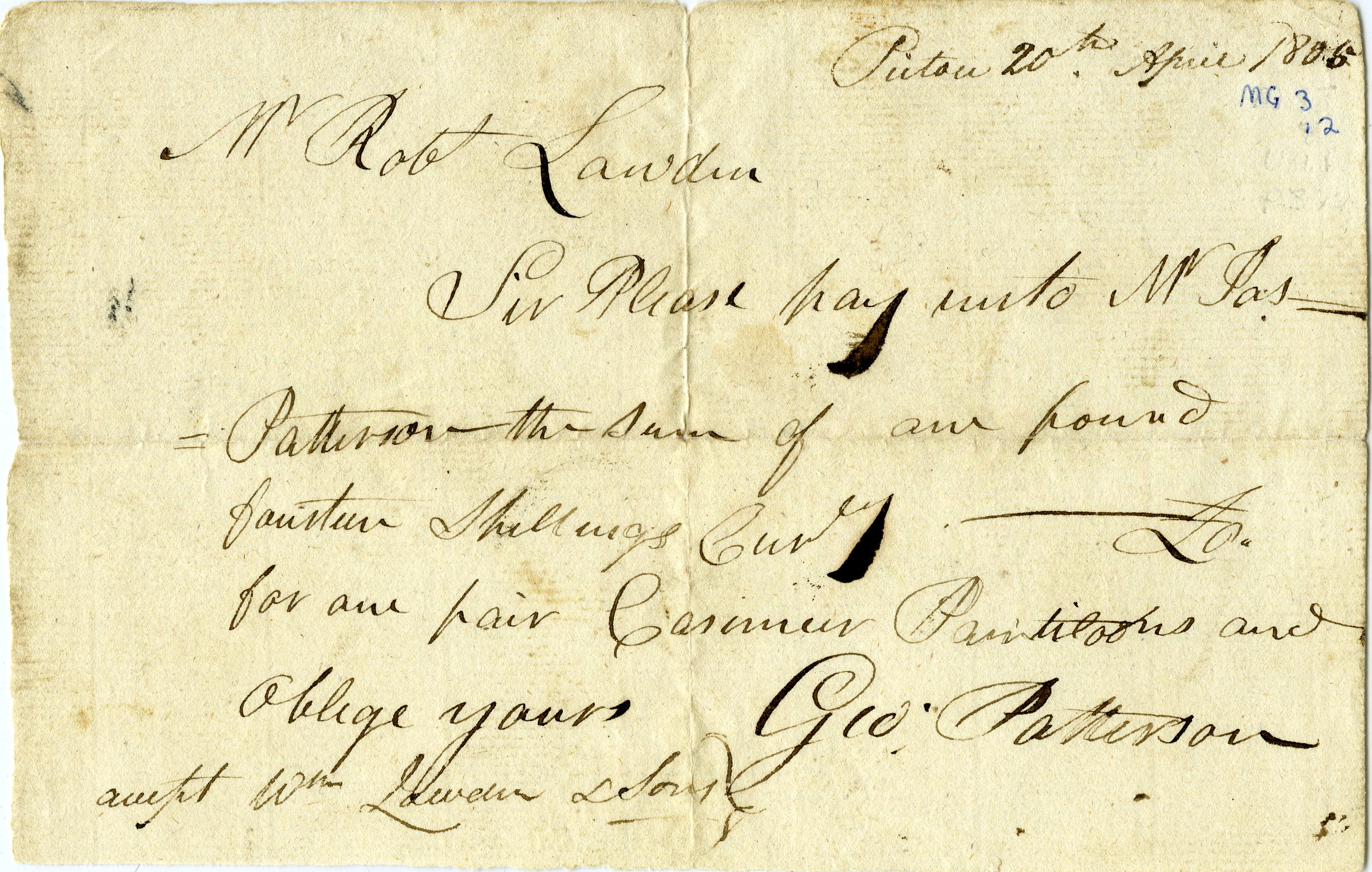 Sir Please pay unto Mr. Jas Patterson the sum of one pound fourteen Shillings