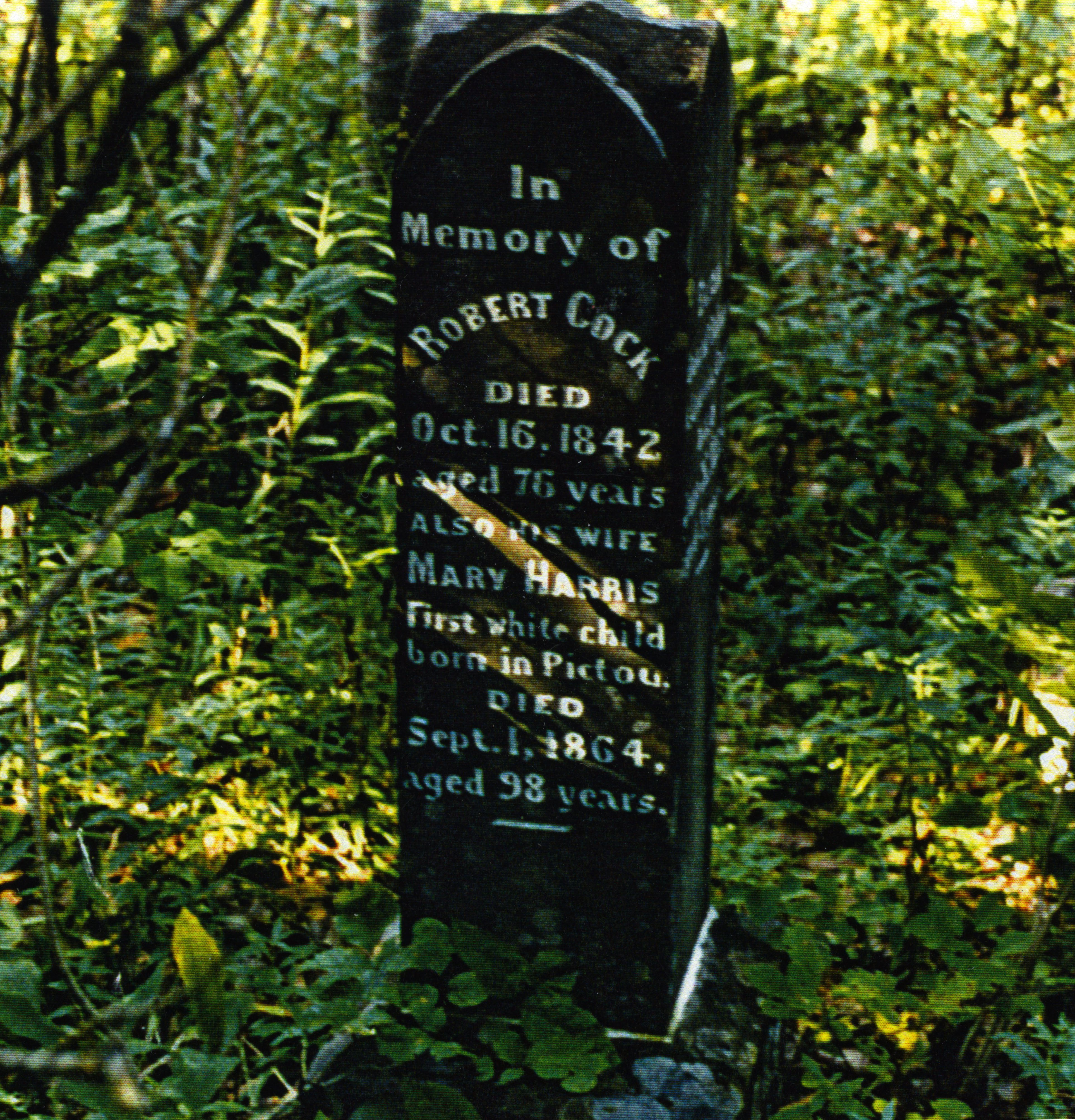 Also his wife Mary Harris, First white child born in Pictou. Died September 1, 1864, aged 98 years.