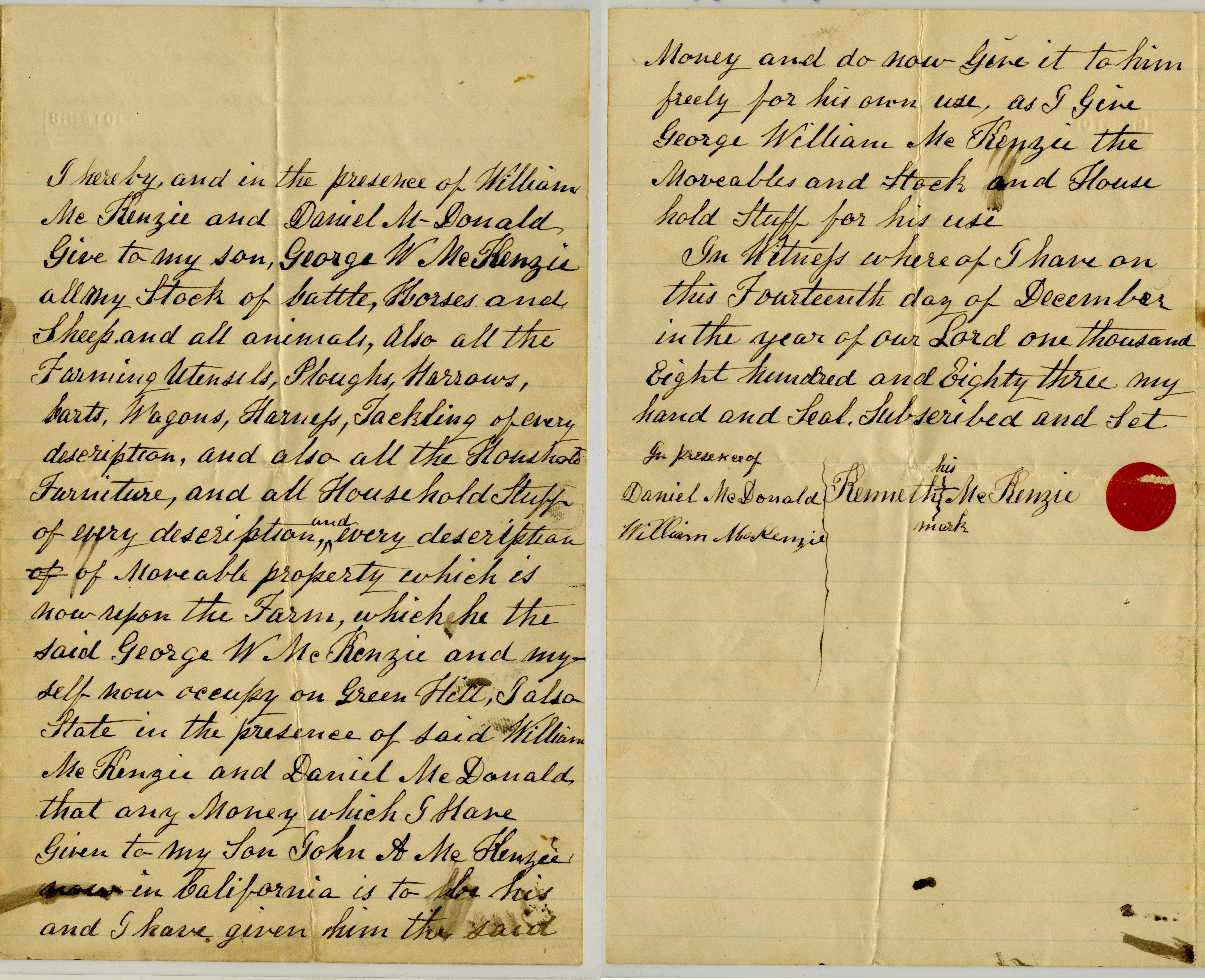 I hereby and in the presence of William McKenzie and Daniel M'Donald Give to my son, George W McKenzie all my Stock of Cattle, Horses and Sheep and all animals, also all the Farming untensils, Ploughs, Harrows, Carts, Wagons, Harnesses, Tackling of every description, and also all the Household Furniture, and all Household Stuff of every description and every description of moveable property which is now upon the Farm, which he the said George W McKenzie and myself now occupy on Green Hill, I also State in the presence of said William McKenzie and Daniel McDonald, that any Money which I have Given to my Son John A McKenzie in California is to be his and I have given him the said Money and do now Give it to him freely for his own use, as I Give George William McKenzie the moveables and Stock and Household Stuff for his use.