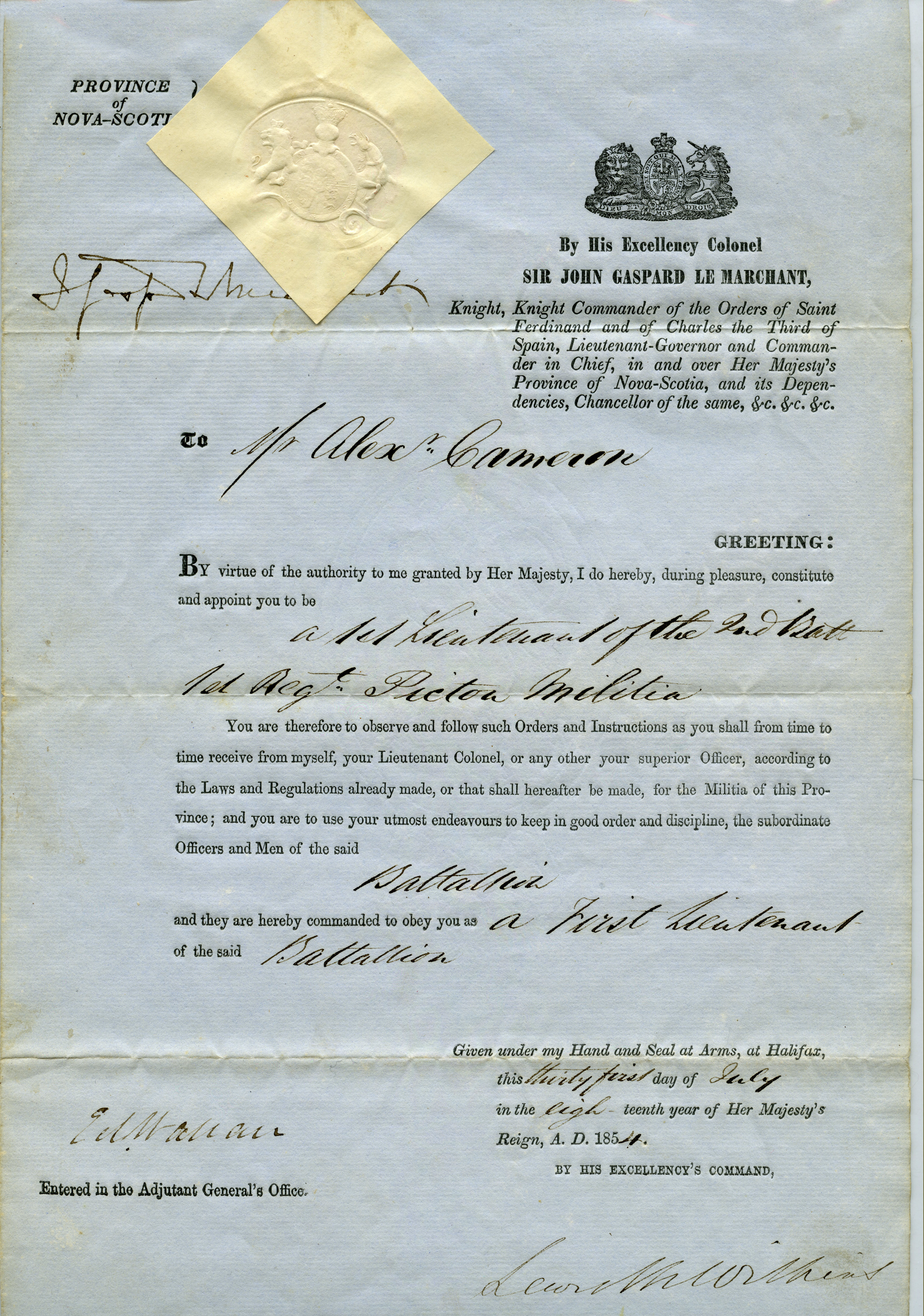 Document appointing Alexander Cameron, 1st Lieutenant of the 2nd Battalion 1st Regiment Pictou Militia. Appointed by Sir John Gaspard Le Marchant, Lieutenant Governor of Nova Scotia. Dated 31 July 1854.