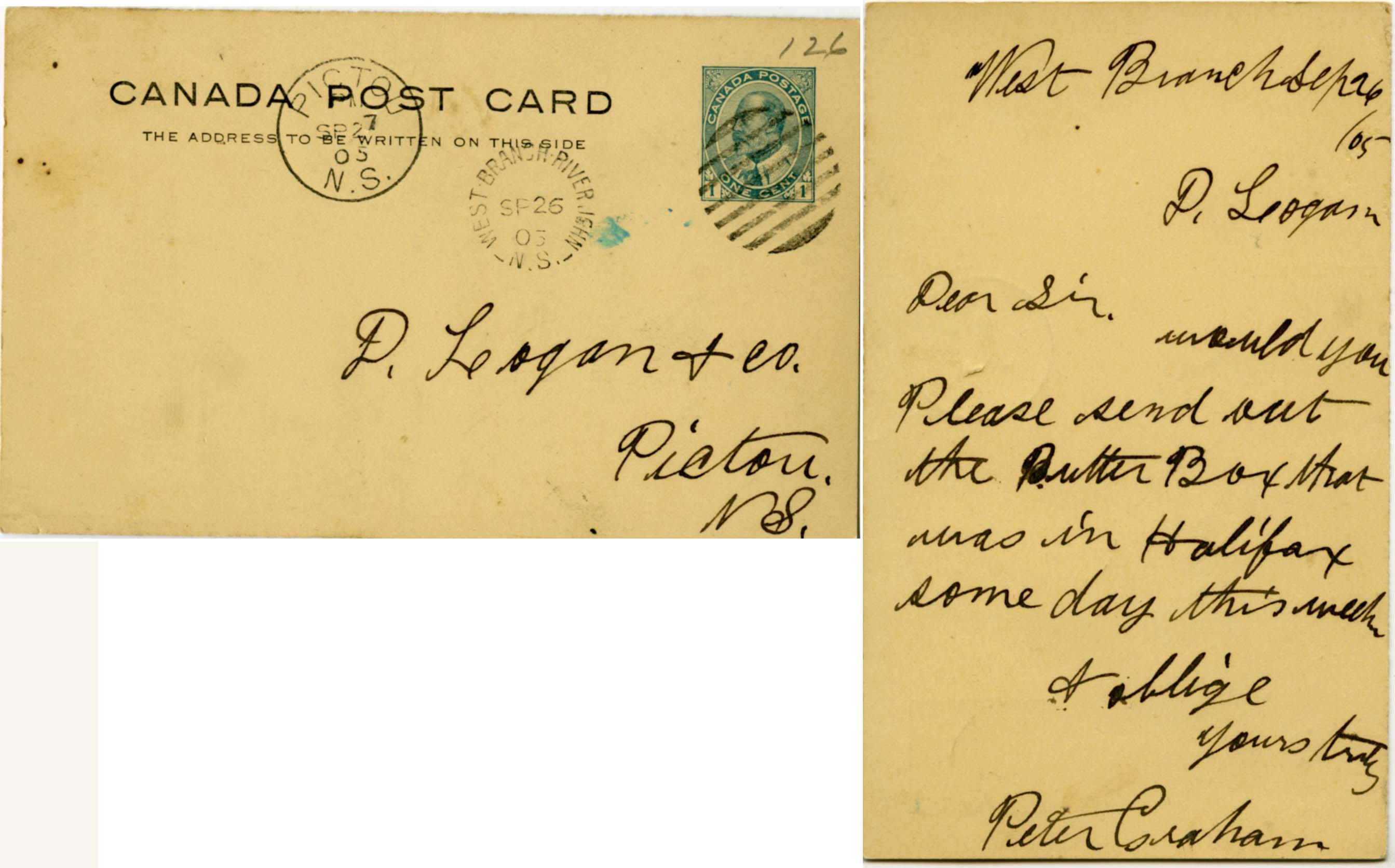 West Branch Sept 26/05, D. Logan, Dear Sir, would you please send out the butter box that was in Halifax some day this week, and oblige yours truly, Peter Graham