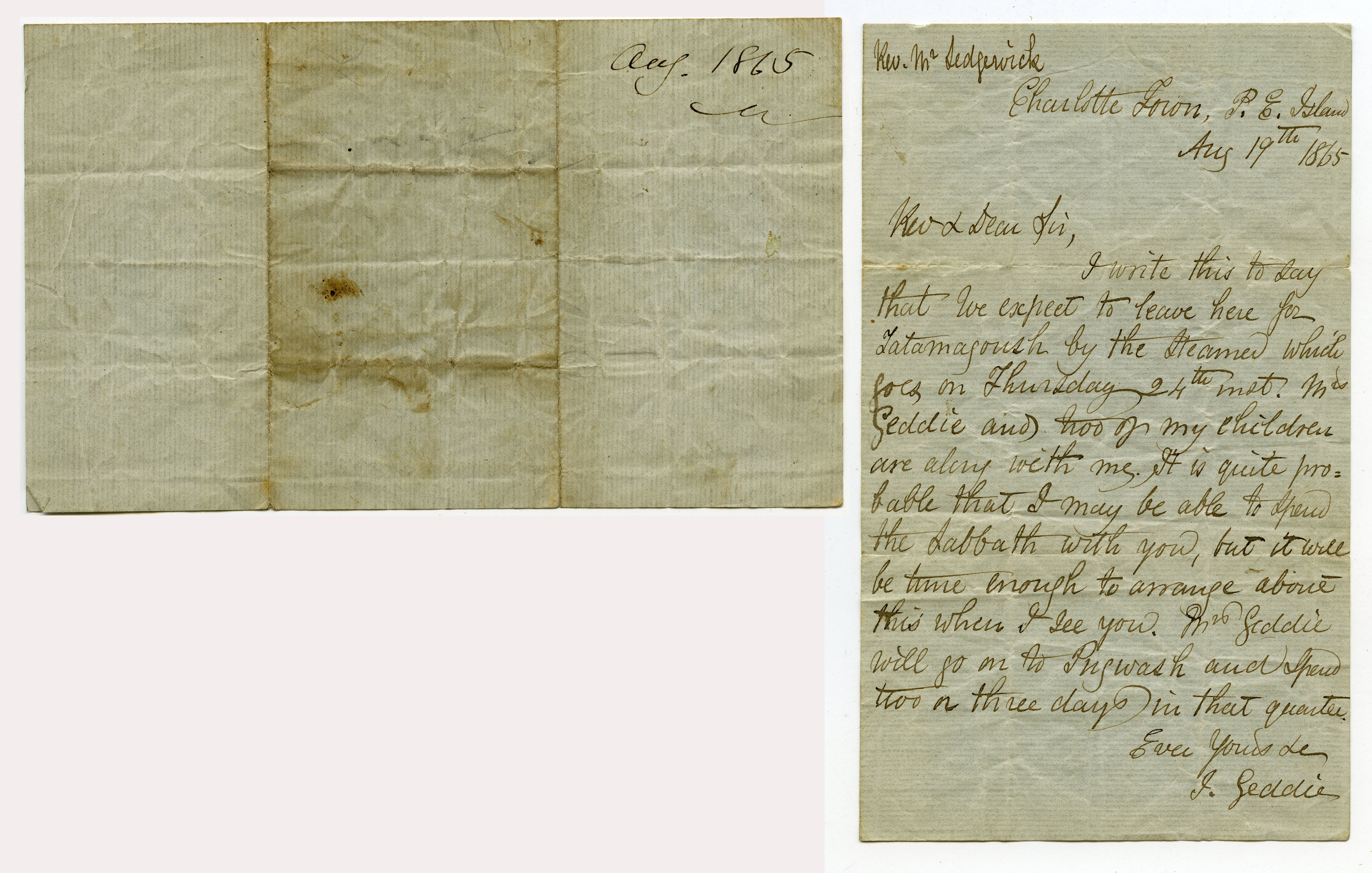 I write this day that we expect to leave here for Tatamagoush by the steamer which goes on Thursday 24th inst. Mrs Geddie and two of my children are along with me. It is quite probable that I may be able to spend the Sabbath with you, but it will be time enough to arrange about this when I see you. Mrs Geddie will go on to Pugwash and spend two or three days in that quarter.