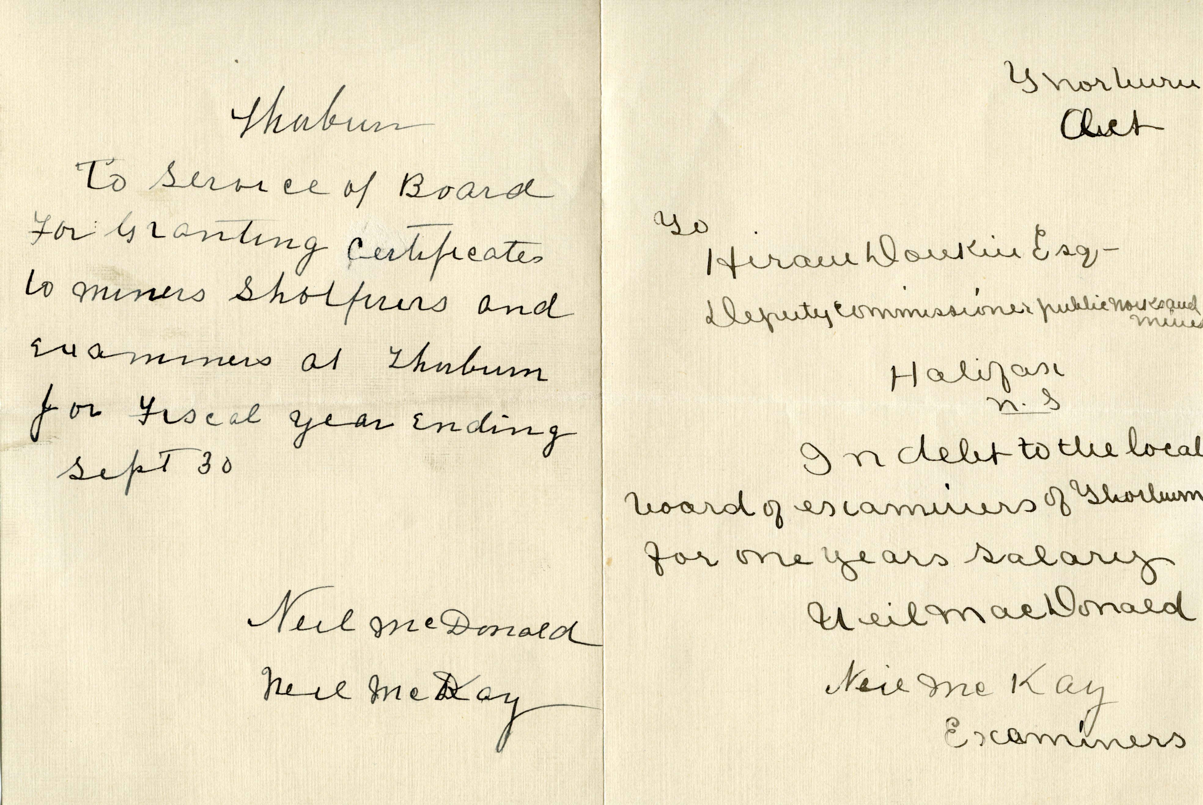 To Service of Board for granting certificates to miners [shorfirers?] and examiners at Thorburn for fiscal year ending Sept 30.