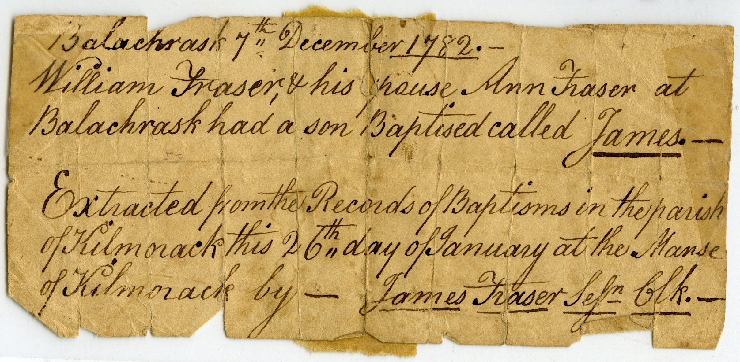 Extracted from the Records of Baptisms in the parish of Kilmorack this 26th day of January at the manse of Kilmorack by James Fraser Sesn. Clerk"