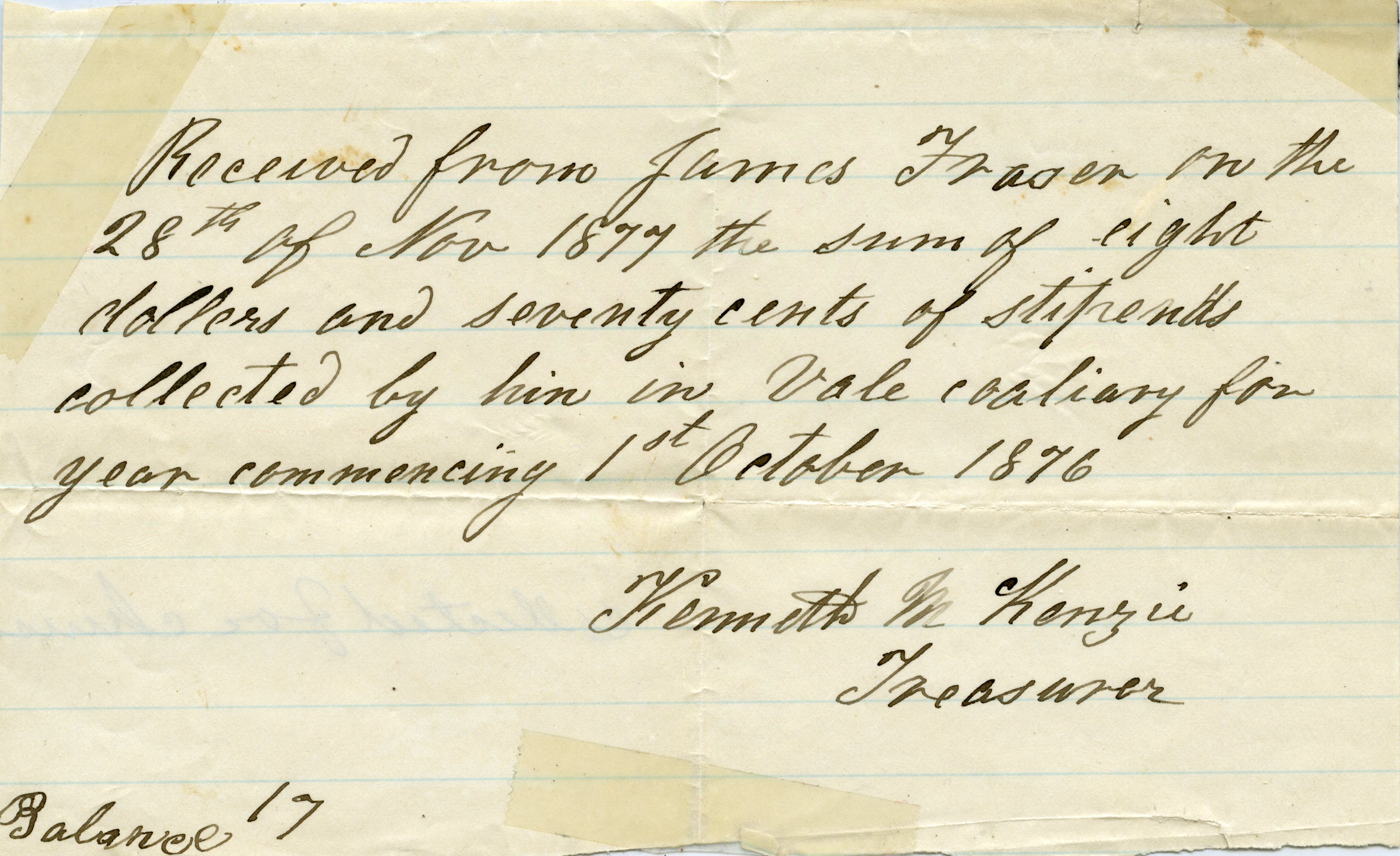 "Received from James Fraser on the 28th of November 1877 the sum of eight dollers and seventy cents of stipends collected by him in Vale coaliary for year commencing 1st October 1876.