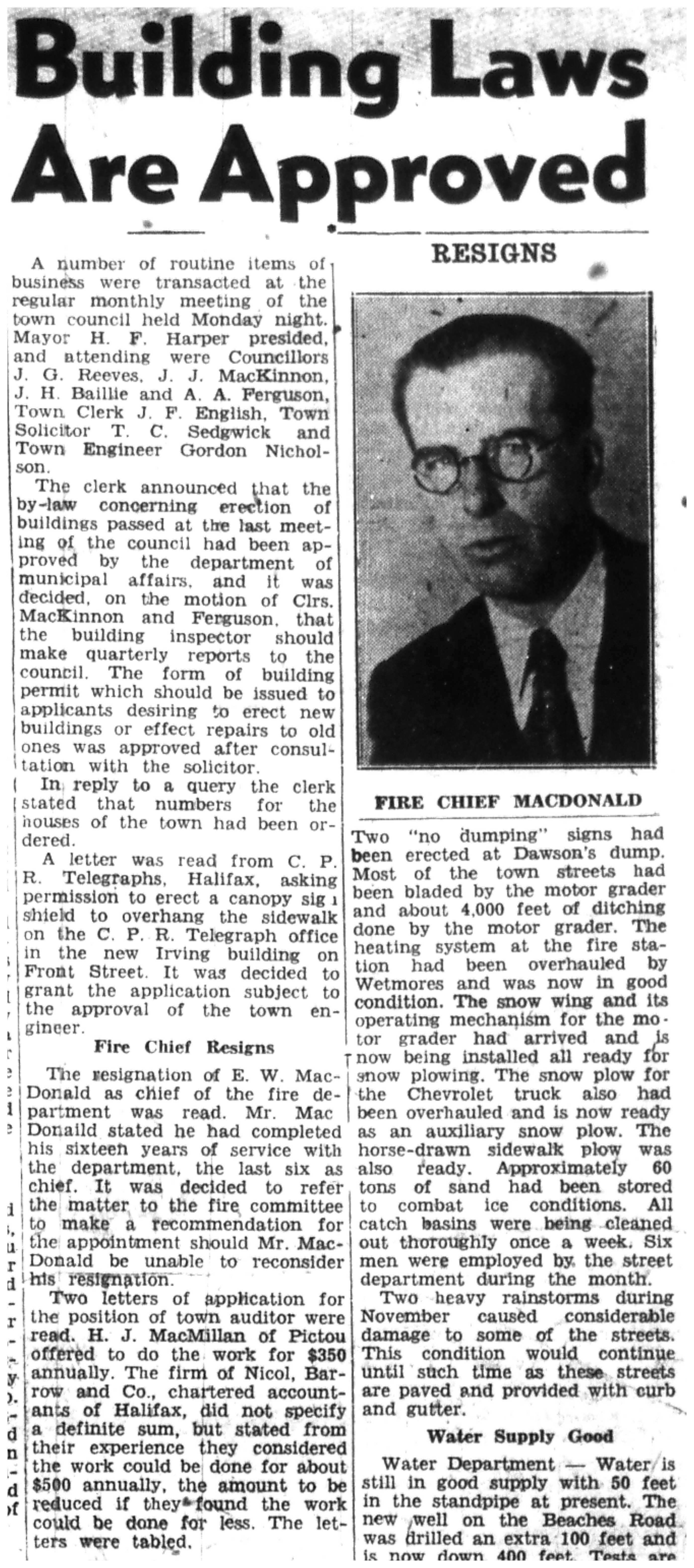 "Fire Chief Resigns" section relates back to the photo included in the article. The rest of the article detailing the 'Water Supply Good' can be found in the December 6, 1945 issue of the Pictou Advocate on page 1.