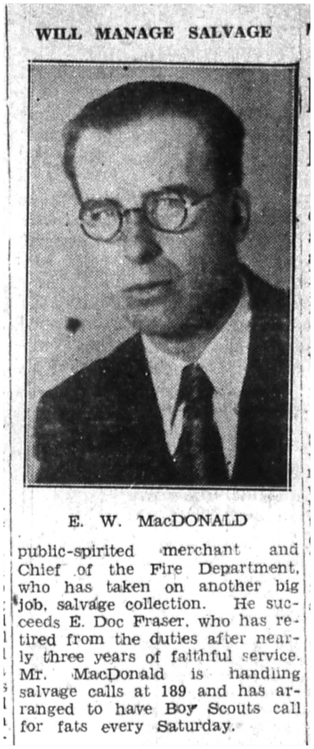 public-spirited merchant and Chief of the Fire Department, who has taken on another big job, salvage collection. He suceeds E. Doc Fraser, who has retired from the duties after nearly three years of faithful service. Mr. MacDonald is handing salvage calls at 189 and has arranged to have Boy Scouts call for fats every Saturday."