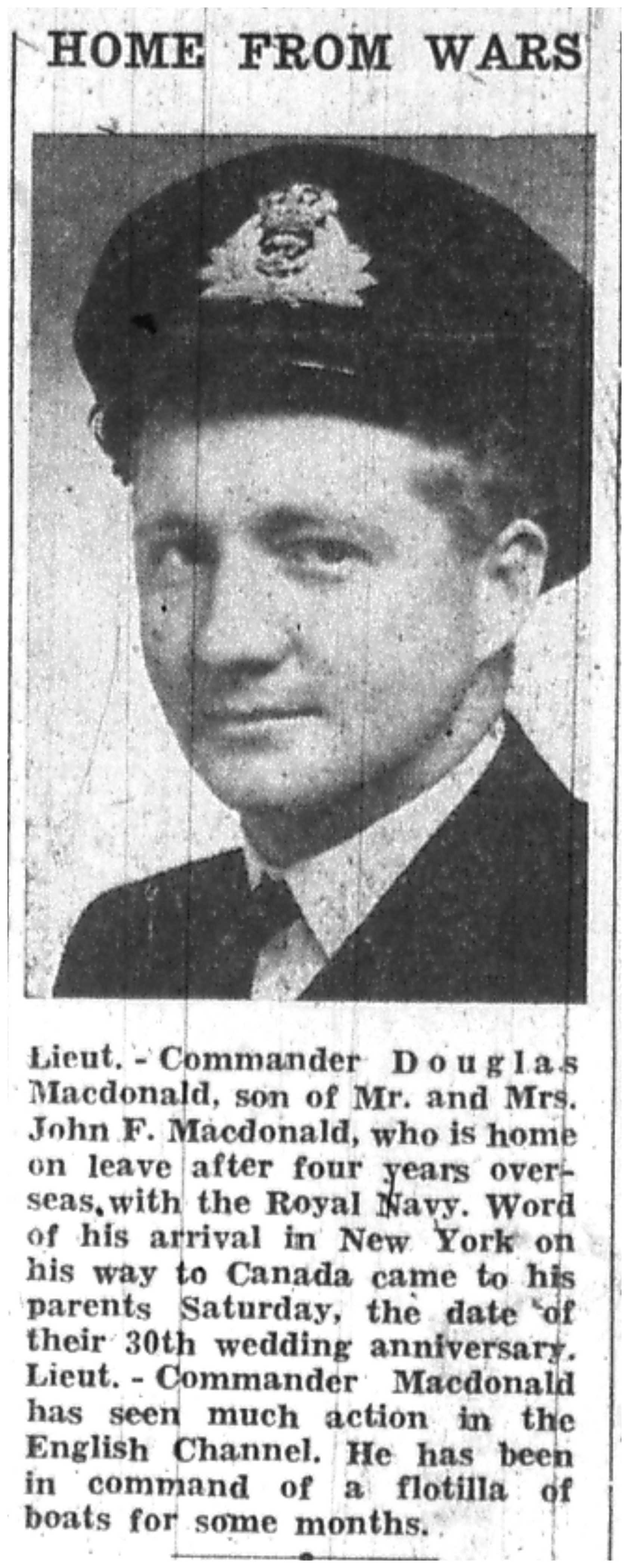 "Lieut. -Commander Douglas Macdonald, son of Mr. and Mrs. John F. Macdonald, who is home on leave after four years overseas, with the Royal Navy. Word of his arrival in New York on his way to Canada cam to his parents Saturday, the date of their 30th wedding anniversary. Lieut. -Commander Macdonald has seen much action in teh English Channel. He has been in command of a flotilla of boats for some months.