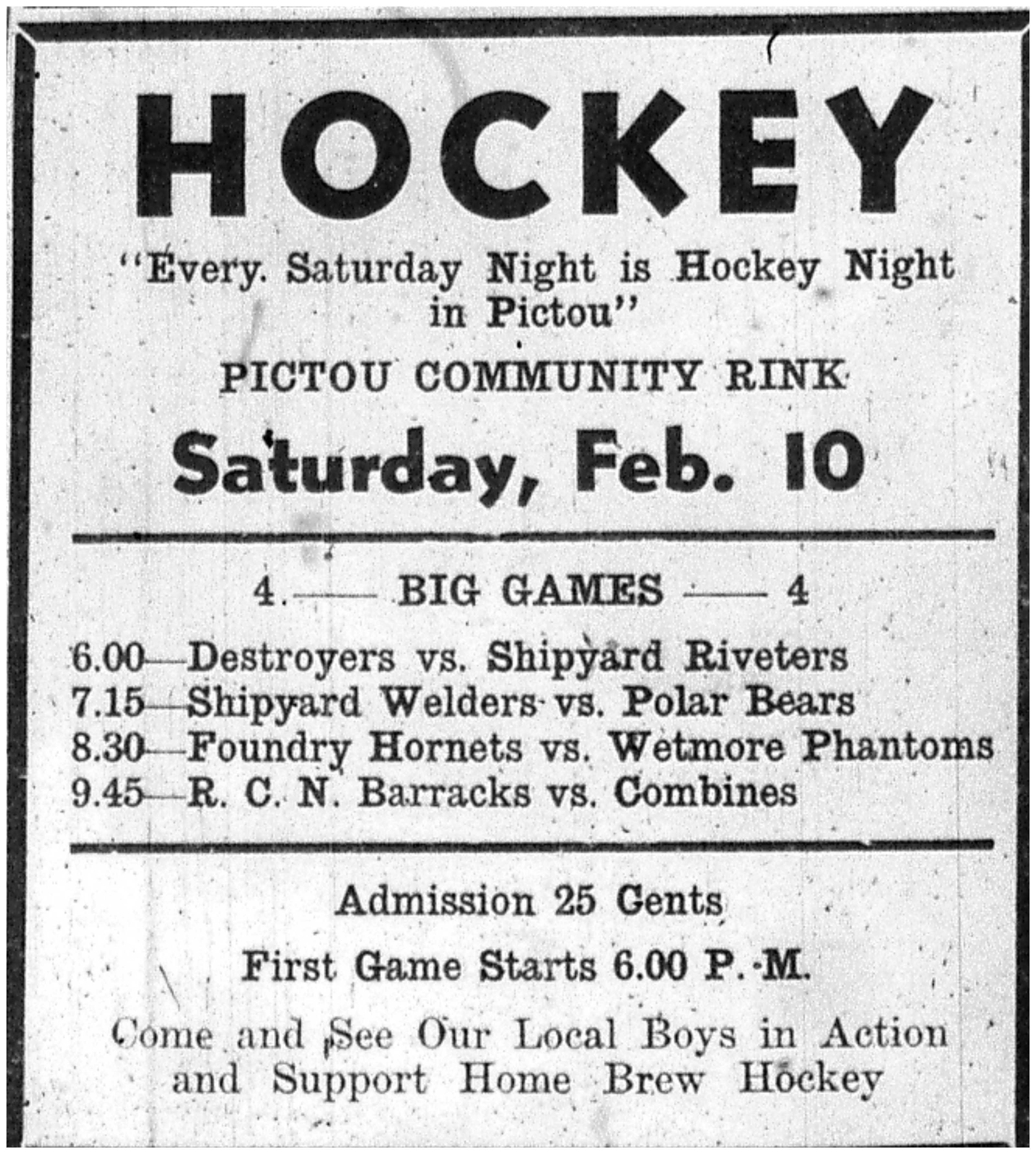 List of the 4 big games on Saturday Night at the Pictou Rink. "Every Saturday Night is Hockey Night in Pictou" Ad for hockey games at the old rink on Water Street in the Feb 8, 1945 Pictou Advocate.