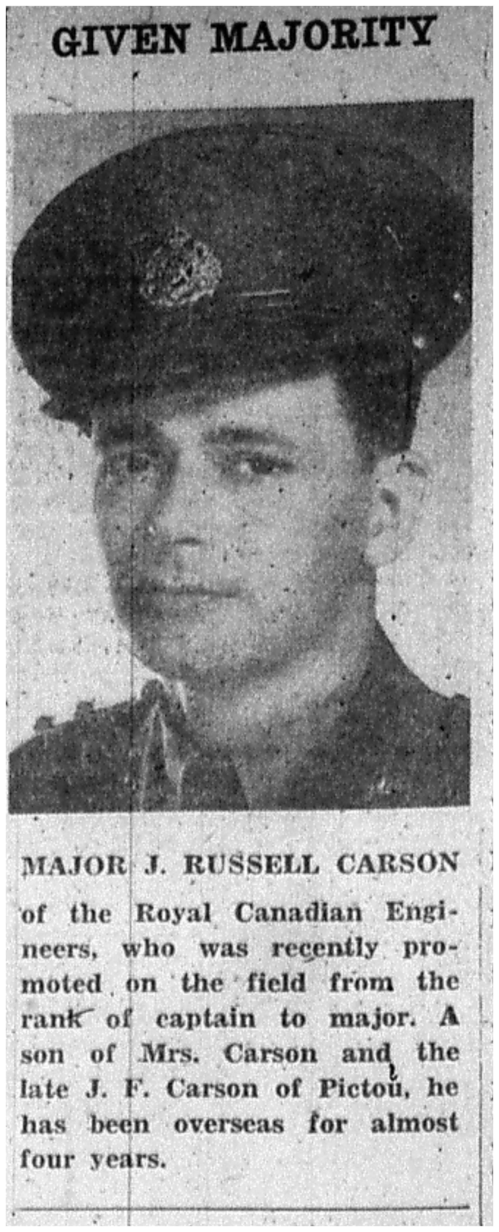 Short article from March 15, 1945 Pictou Advocate about Major J. Russell Carson.