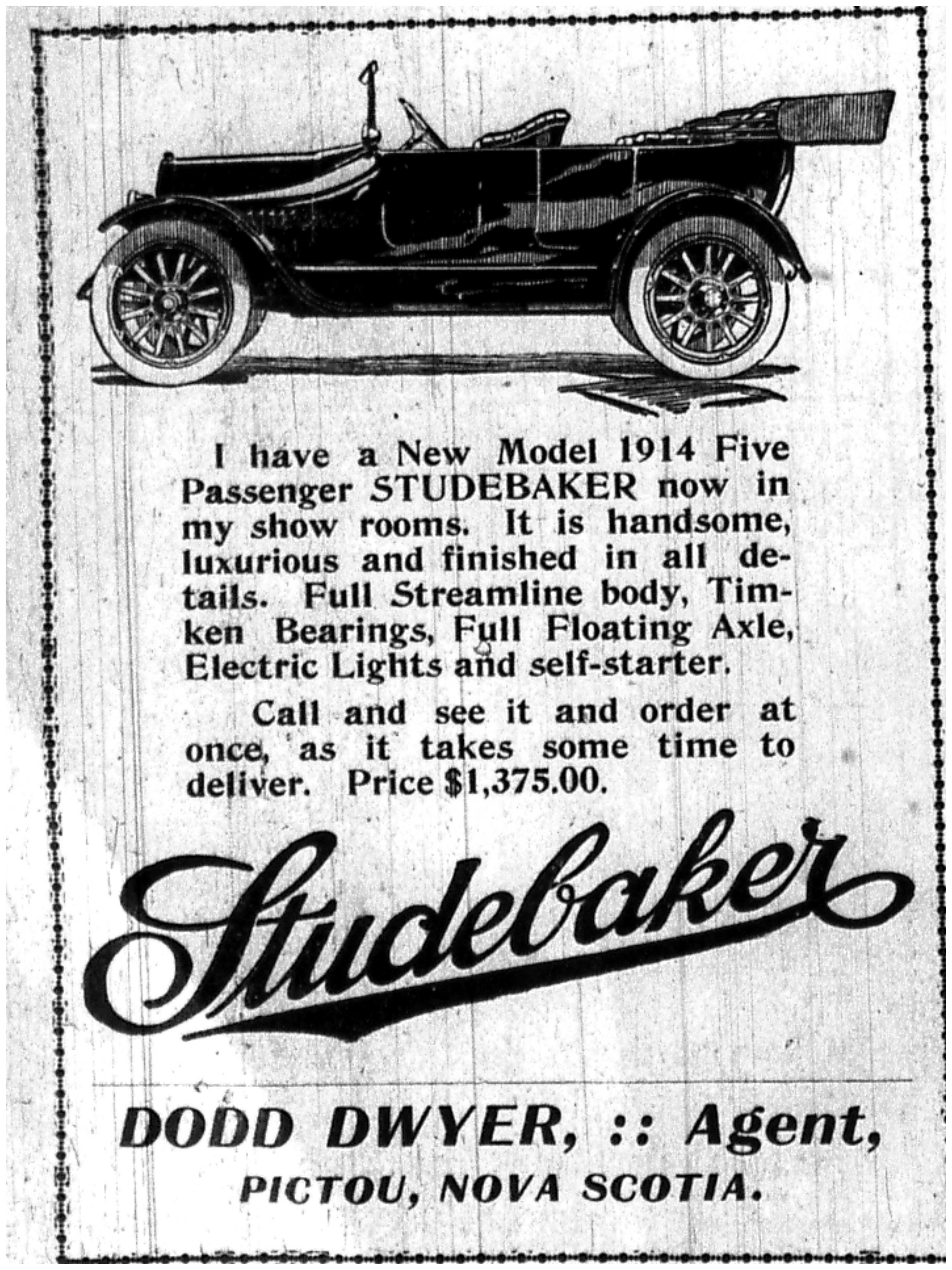 | Tags: | Dodd Dwyer, Pictou, car, Studbaker, Pictou Advocate, newspaper, advertisement |