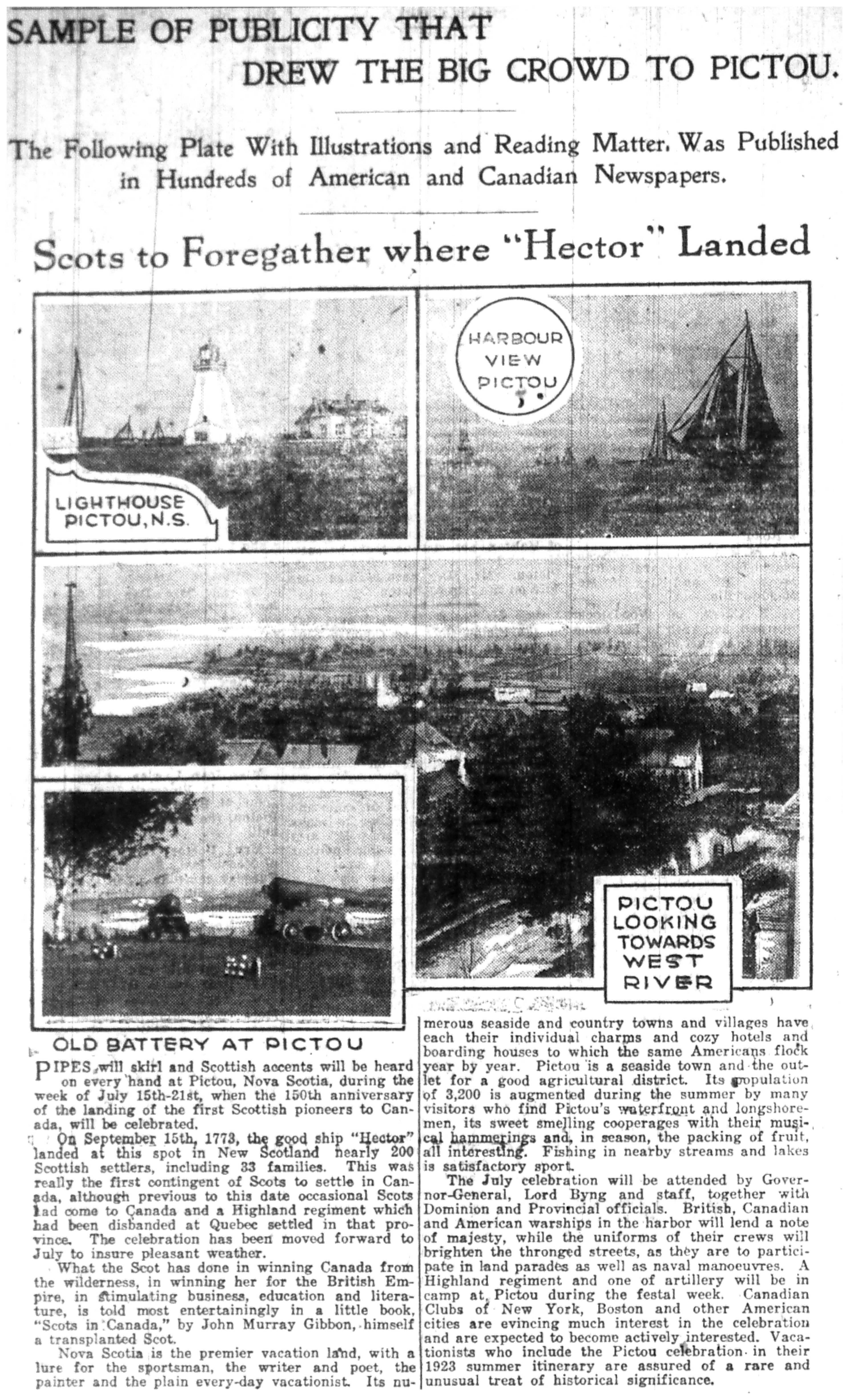 Article about 150th celebration of the landing of the Ship Hector in Pictou from the 17th August 1923 Pictou Advocate