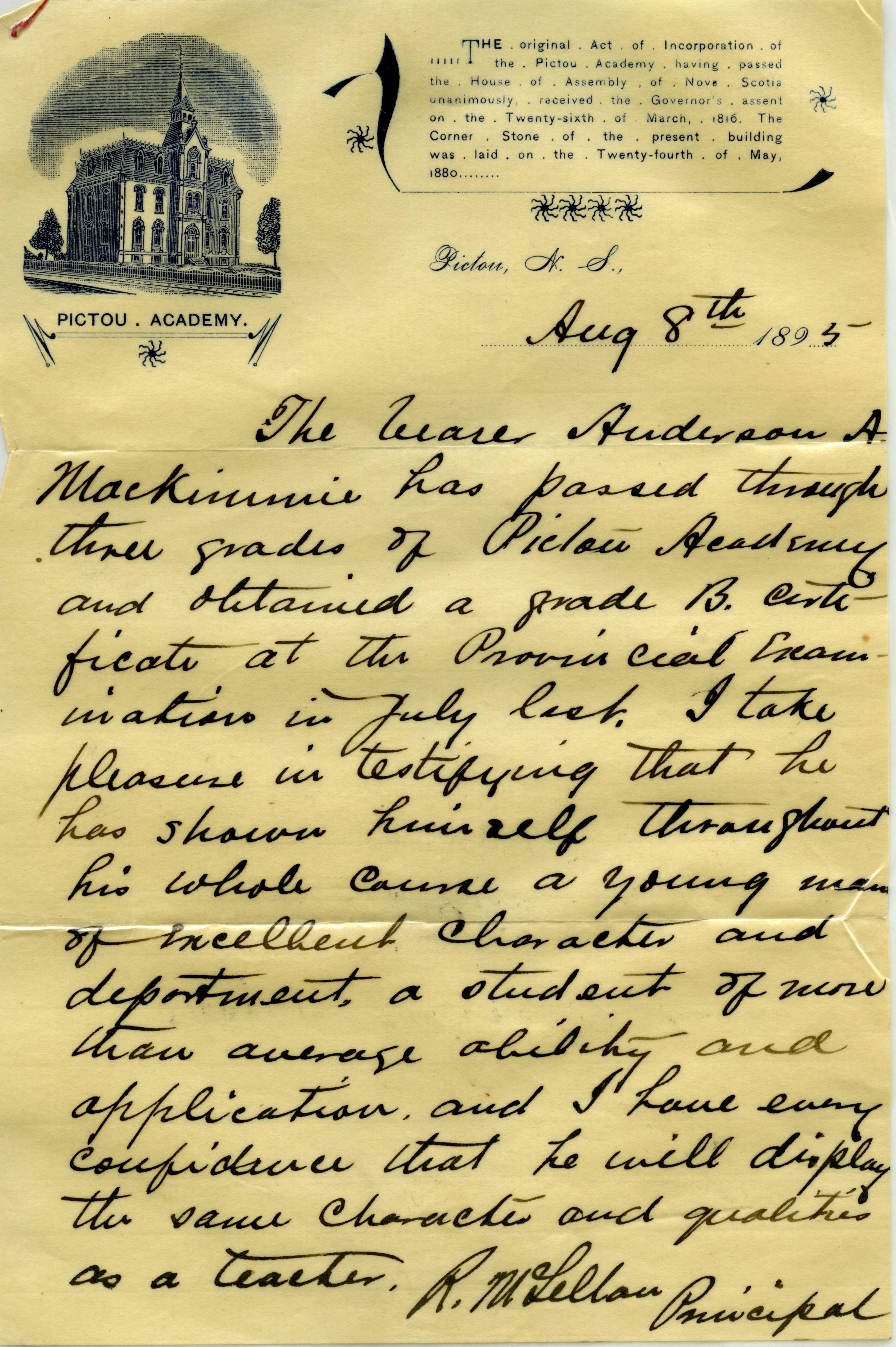 The bearer Anderson A MacKimmie has passed through three grades of Pictou Academy and obtained a grade B certificate at the Provincial Examinations in July last. I take pleasure in testifying that he has shown himself throughout his whole course a young man of excellent character and deportment, a student of more than average ability and application, and I have every confidence that he will display the same character and qualities as a teacher.