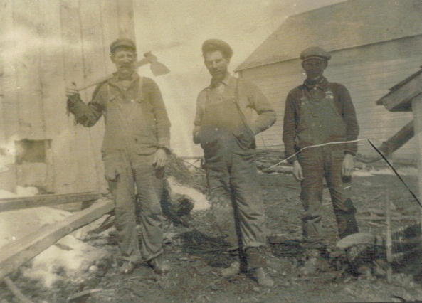 Three men posing for photograph, one holding axe.