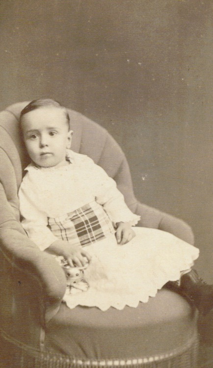 Toddler sitting for photograph. He is hold a rattle and wearing a tartan sash.