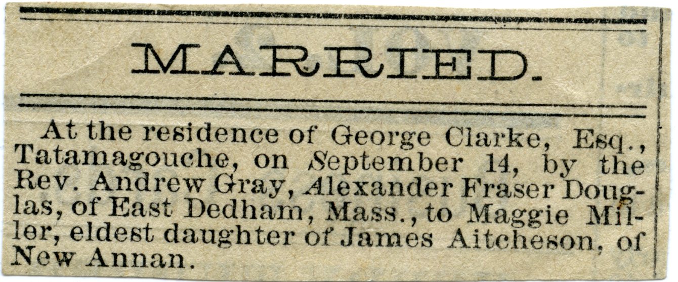 At the residence of George Clarke. Esq., Tatamagouche, on September 14, by the Rev. Andrew Gray, Alexander Fraser Douglas, of East Dedham, Mass., to Maggie Miller, eldest daughter of James Aitcheson, of New Annan.