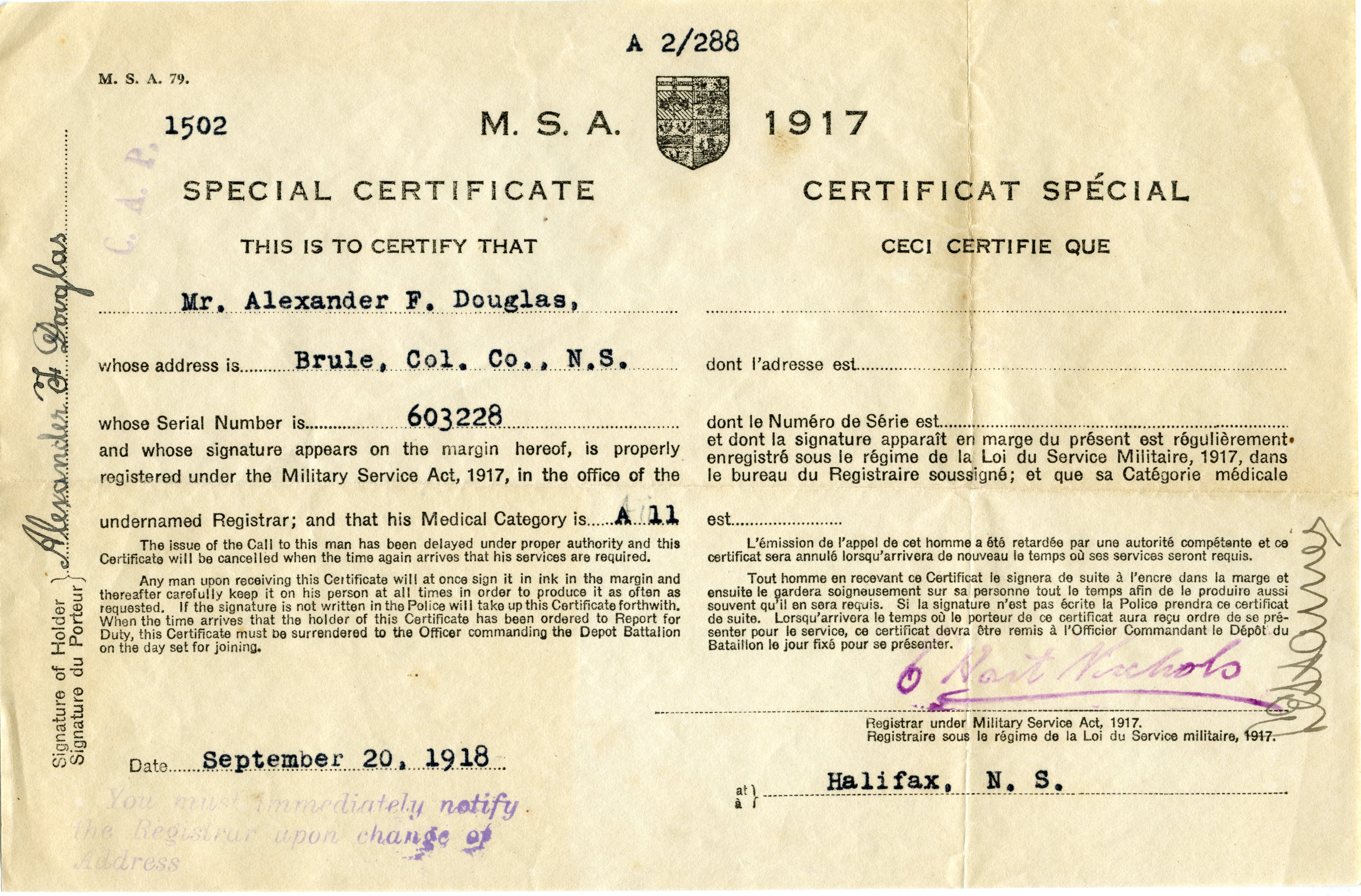 Mr. Alexander F. Douglas, Brule, Col. Co., NS whose serial number is 603228 and whos signature appears on the margin is poperly registered under the Military Service Act, 1917, in the office of the undernamed Registrar; and that his Medical Category is a A 11.