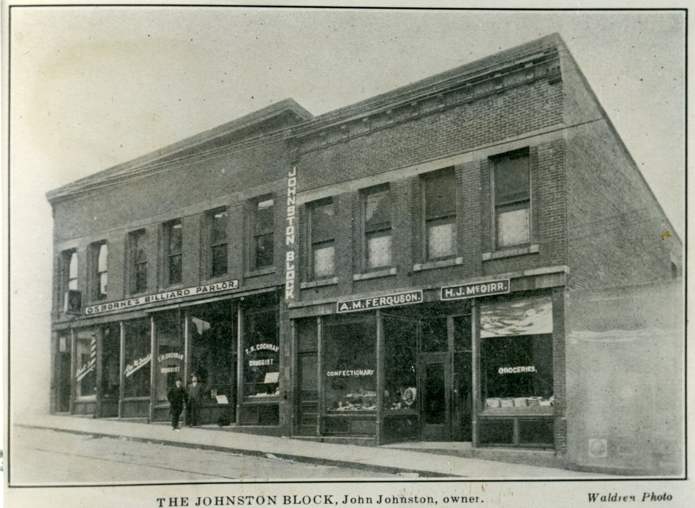Photo of the Johnston Block of buildings in New Glasgow, including A.M. Ferguson's confectionary store, H.J. McGirr.'s Groceries, Osborne's Billard Building, a Barber Shop, and T.W. Cochrain, Druggist's store. Early 1900s, likely from the Trade and Review's 1900 issue.