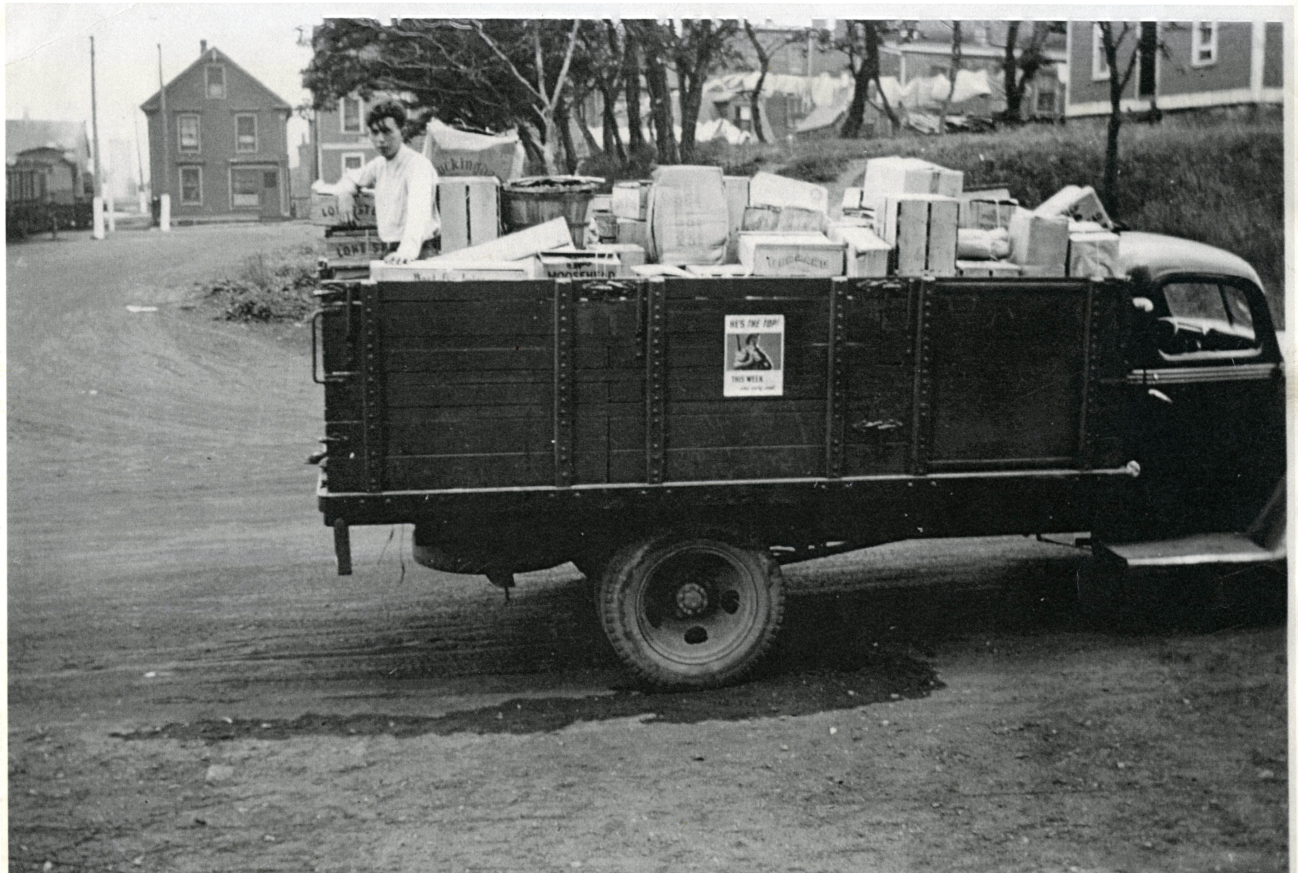 Canadian National Express Truck delivering packages from the CN trains to citizens in Pictou. Don MacIsaac was the driver. Poster on side of the truck was one of many propaganda posters used during WWII.