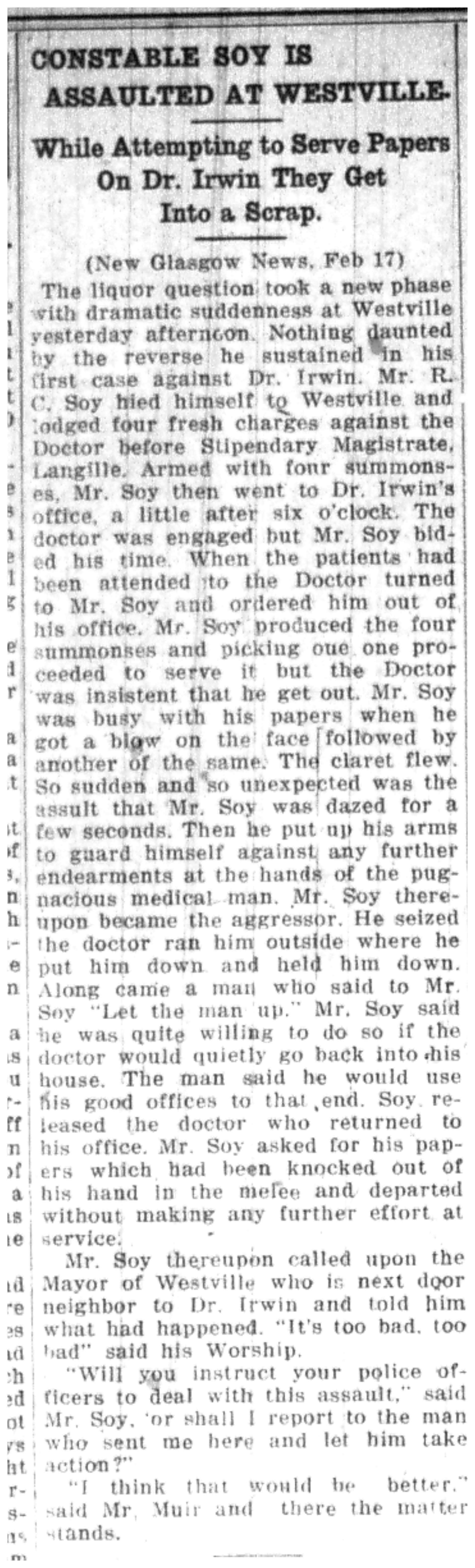 Article from the Feb. 23, 1923 issue of the Pictou Advocate about Constable R.C. Soy attempting to fine Dr. Irwin of Westville for violating liquor restrictions.