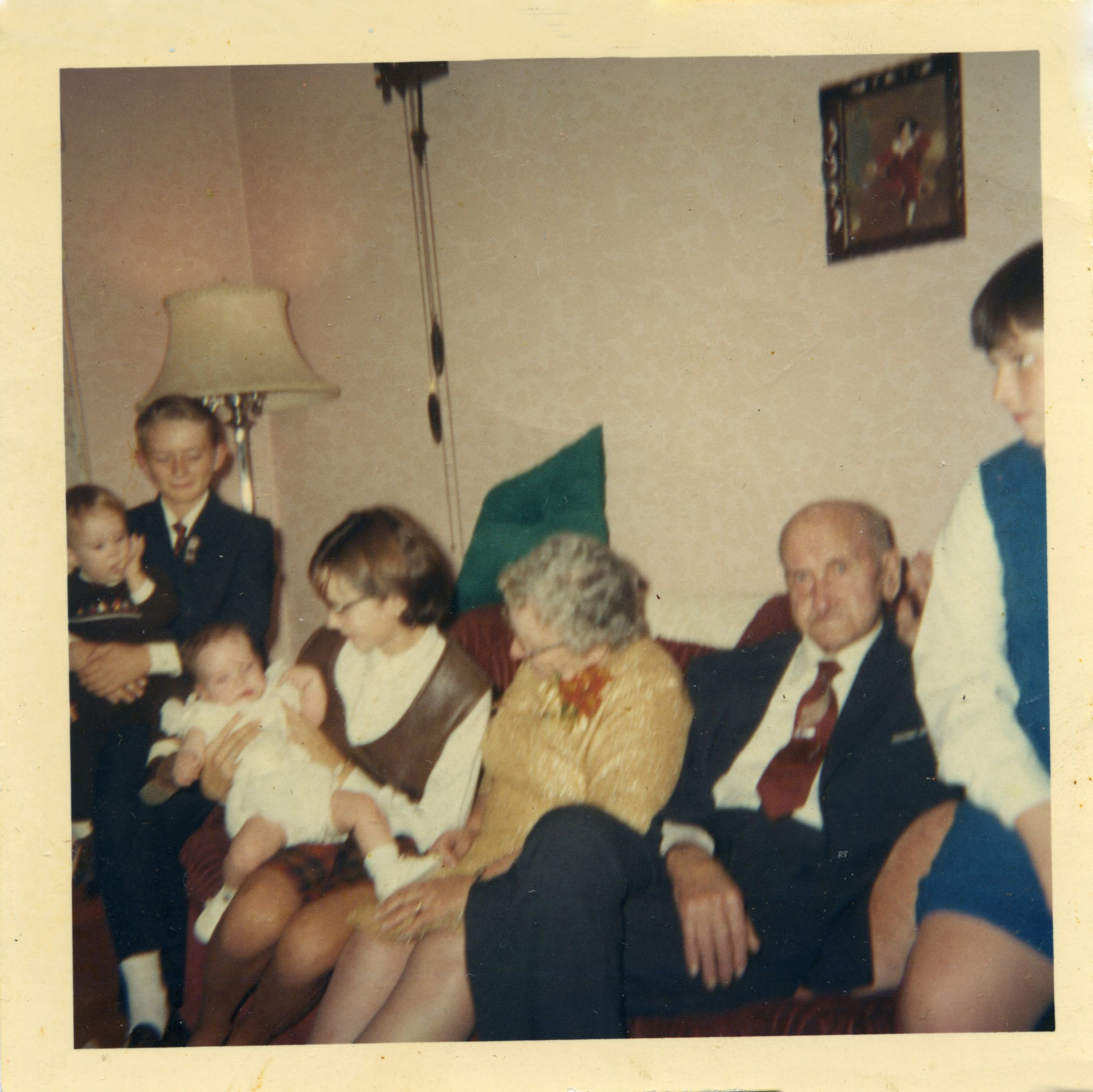 Photo of A.W. Dewar of Broadway and his wife Mary Isabel MacGregor of River John with their grandchildren. From left to right are Bradley Greene (son of Coral Dewar and Herman Greene), Greg Greene (son of Coral and Herman), Brenda MacLeod (daughter of Beth Dewar and Medford MacLeod), Judy MacLeod (daughter of Beth and Medford), Mary Isabel "Maybelle" Dewar (MacGregor), A.W. "Bill" Dewar, and Debbie Greene (daughter of Coral and Herman).