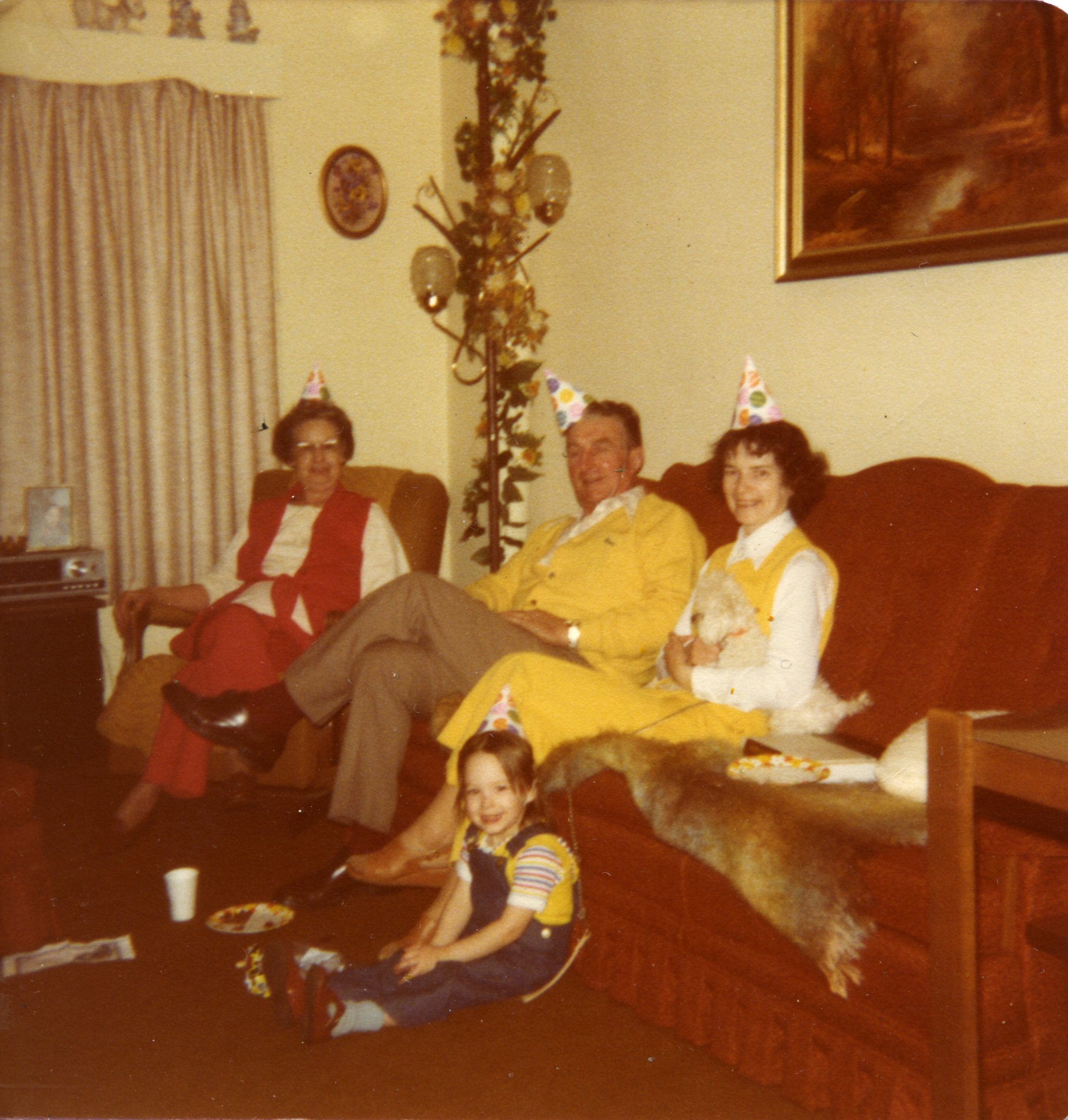 From left to right in back are Pearl Coady, George Coady, and Beth MacLeod (Dewar) (holding her dog Shyla). In front is Shauna Coady, daughter of Judy MacLeod and Ken Coady. Photo taken at Shauna's birthday party held at Beth and her husband Medford MacLeod's home in West River.
