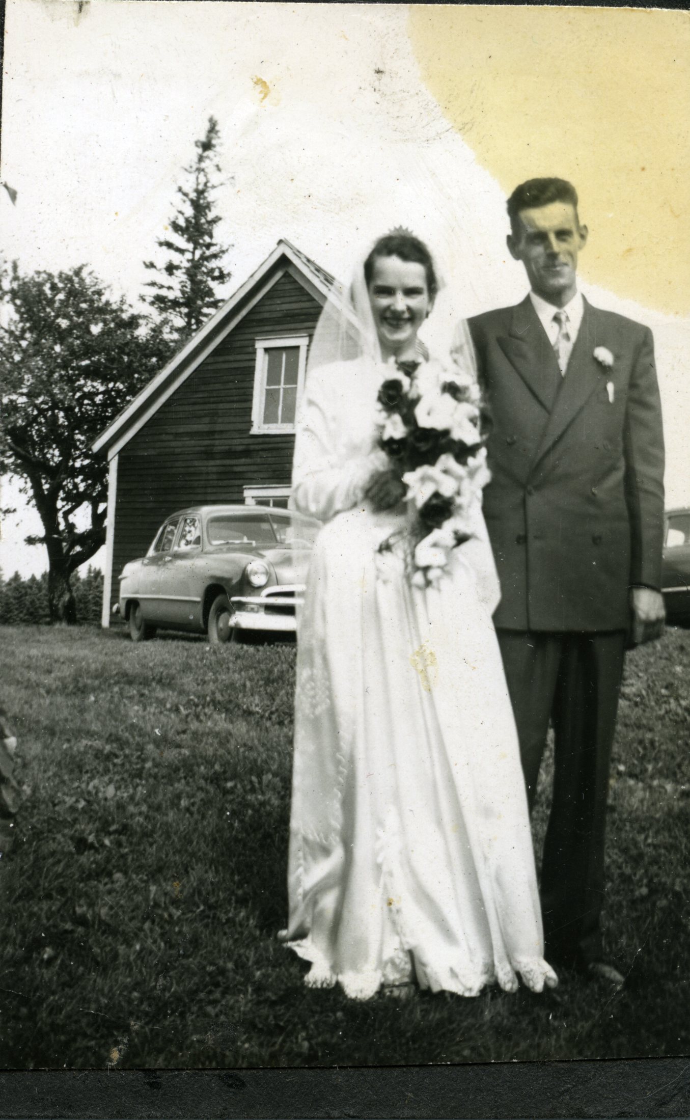 1951 wedding of Beth Dewar and Medford MacLeod. Beth is the daughter of A.W. Dewar and Mary Isabel MacGregor, and Medford is the son of Bessie Brown and Arthur MacLeod of West River. They are pictured here at A. W. Dewar's home in Broadway.