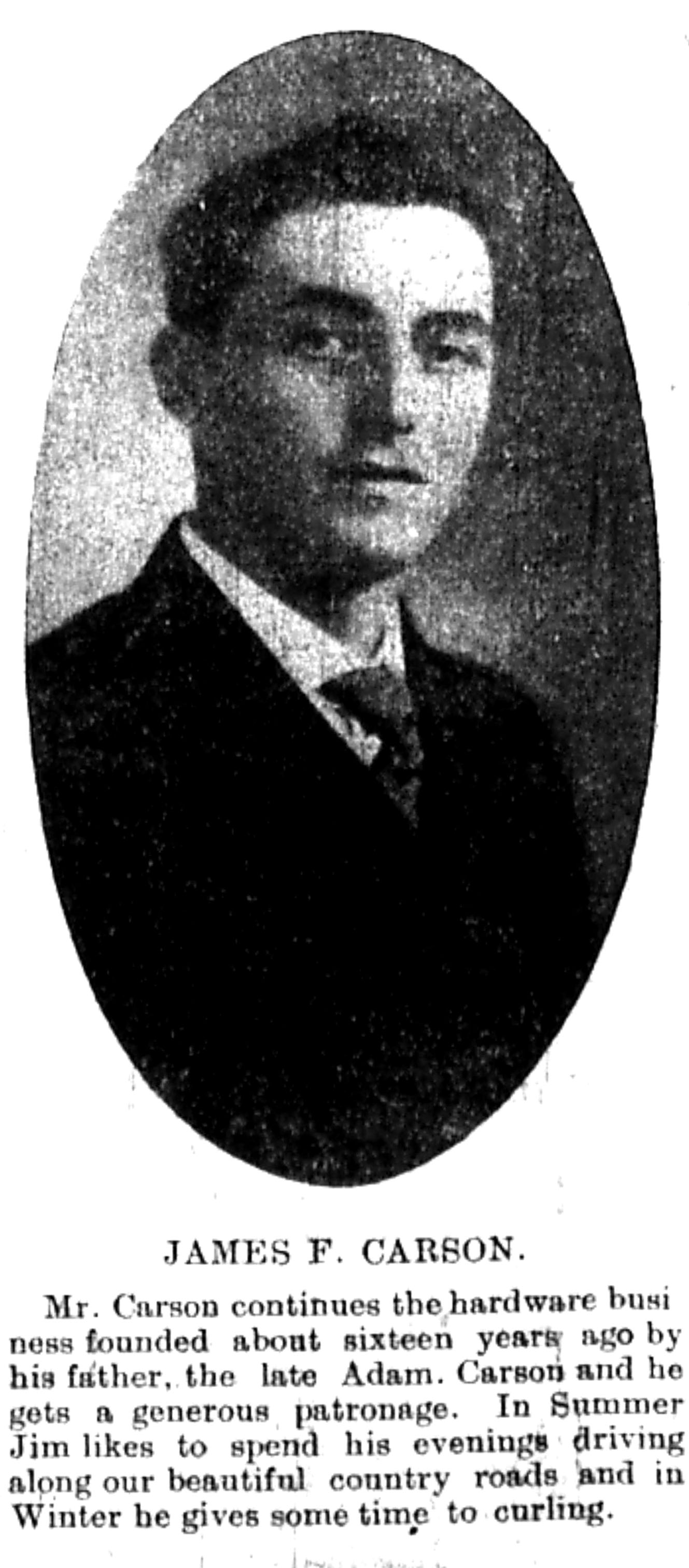 Mr. Carson continues the hardward business founded about sixteen years ago by his father, the late Adam. Carson and he gets a generous patronage. In Summer Jim like to spend his evenings driving along our beautiful country roads and in Winter he gives some time to curling.