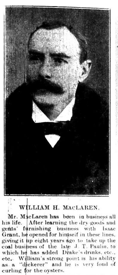Mr. MacLaren has been in business all his life. After learning the dry goods and gents' furnishing business with Isaac Grant, he opened for himself in these lines, giving it up eight years ago to take up the coal business of the late J. T. Paulin, to which he has added Drake's drinks, etc., etc. Williams's strong point is his ability as a "dickerer" and he is very fond of curling for the oysters.