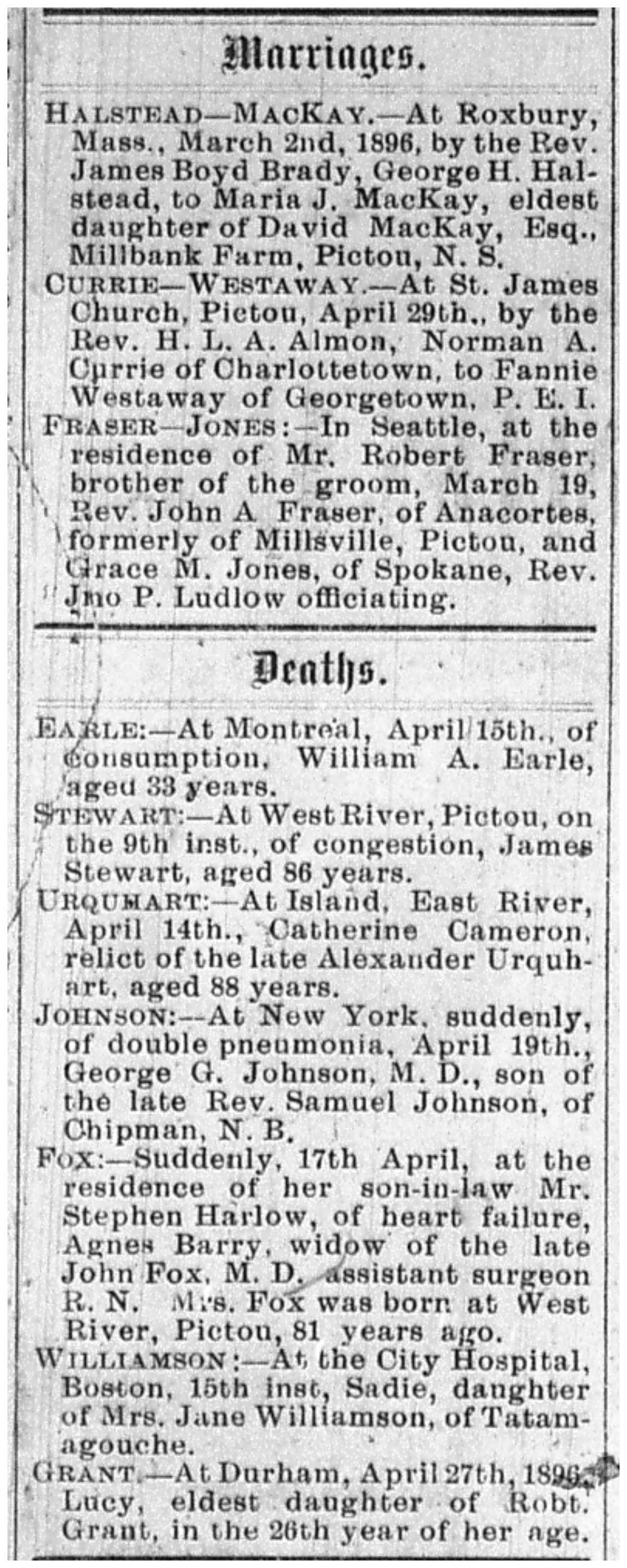 Halstead - MacKay - At Roxbury, Mass., March 2nd, 1896, by the Rev. James Boyd Brady, George H. Halstead, to Maria J. MacKay, eldest daughter of David MacKay, Esq., Millbank Farm, Pictou, N.S.