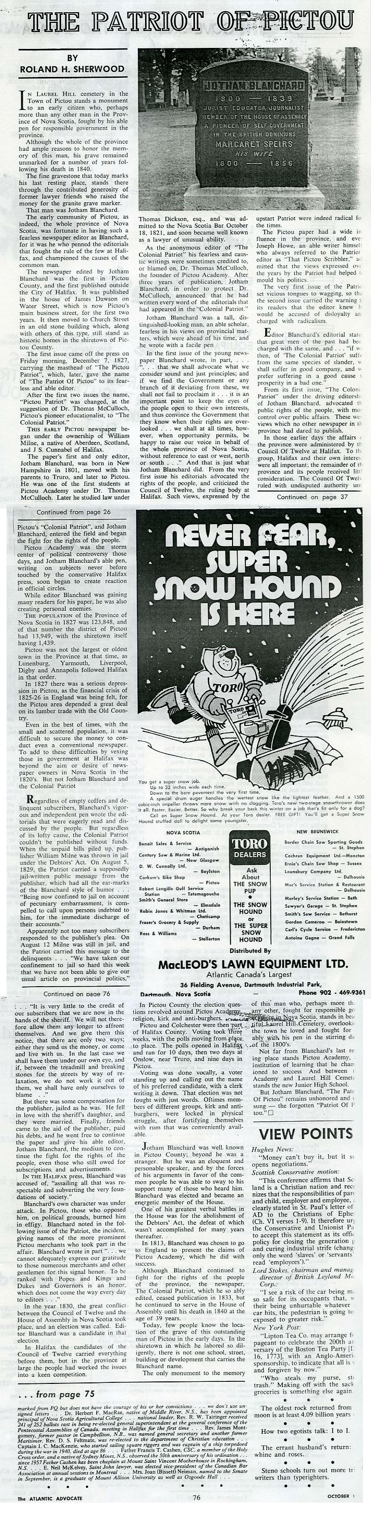 The early community of Pictou, as indeed, the whole province of Nova Scotia , was fortunate in having such a fearless newspaper editor as Blanchard, for it was he who penned the editorials that fought the rule of the few at Halifax, and championed the causes of the common man.