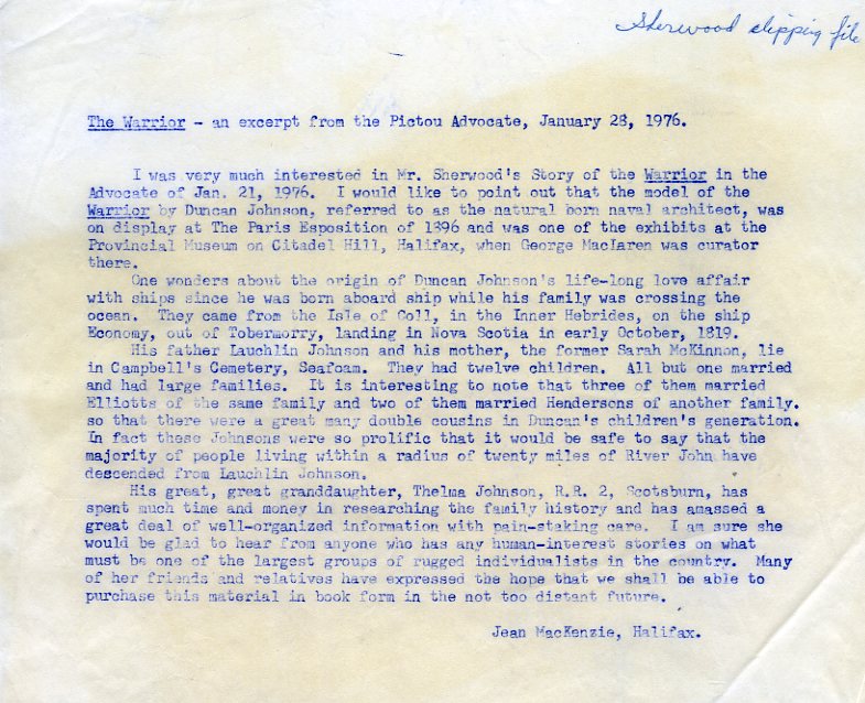 I was very much interested in Mr.Sherwood's Story of the Warrior in the Advocate of Jan.21, 1976. I would like topoint out that the model of the Warrior by Duncan Johnson, referred to ass the natural born naval architect, was on display at the Paris Esposition of 1896, and was one of the exhibits at the Provincial Museum on Citadel Hill, Halifax, when George MacLaren was curator there.